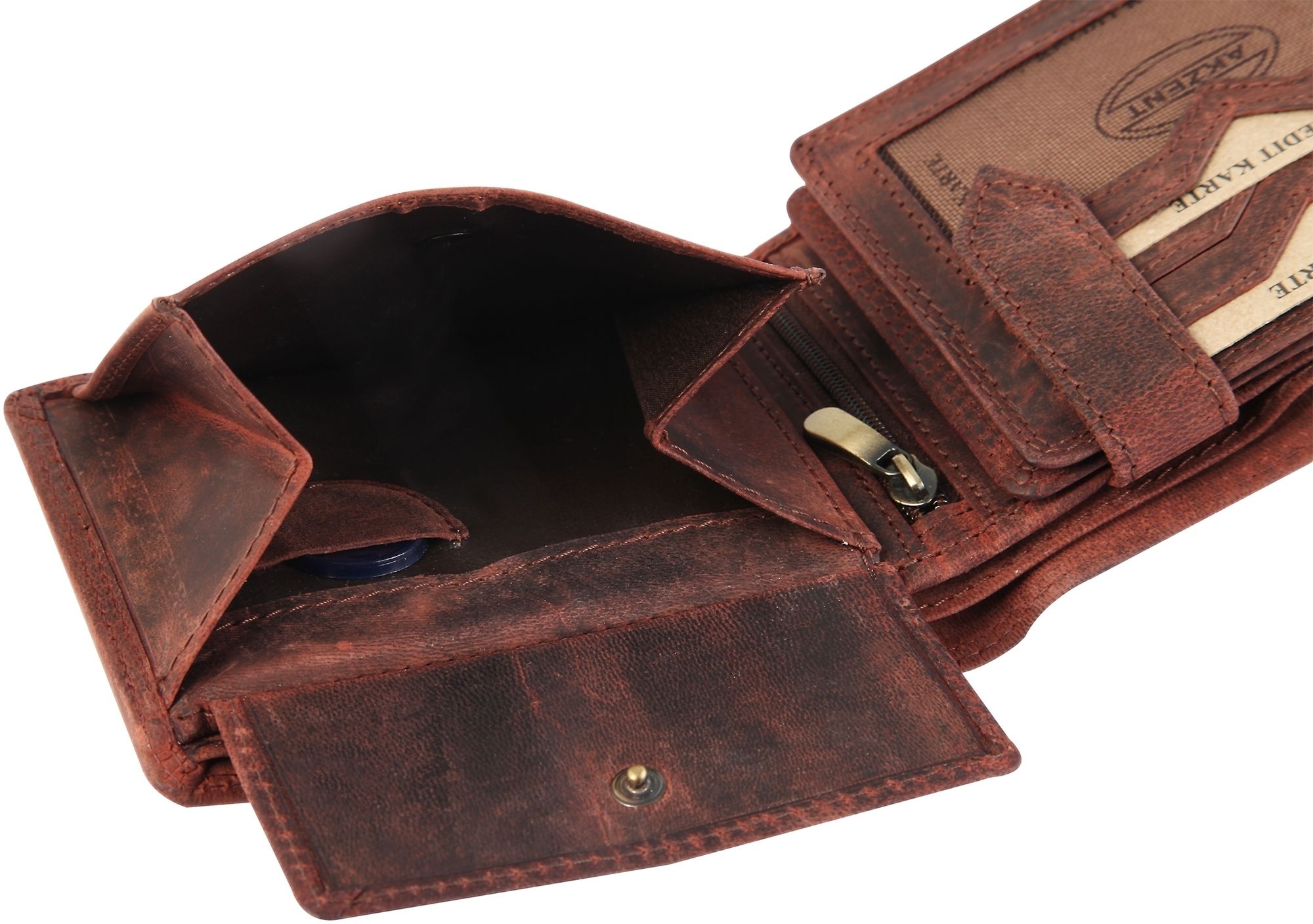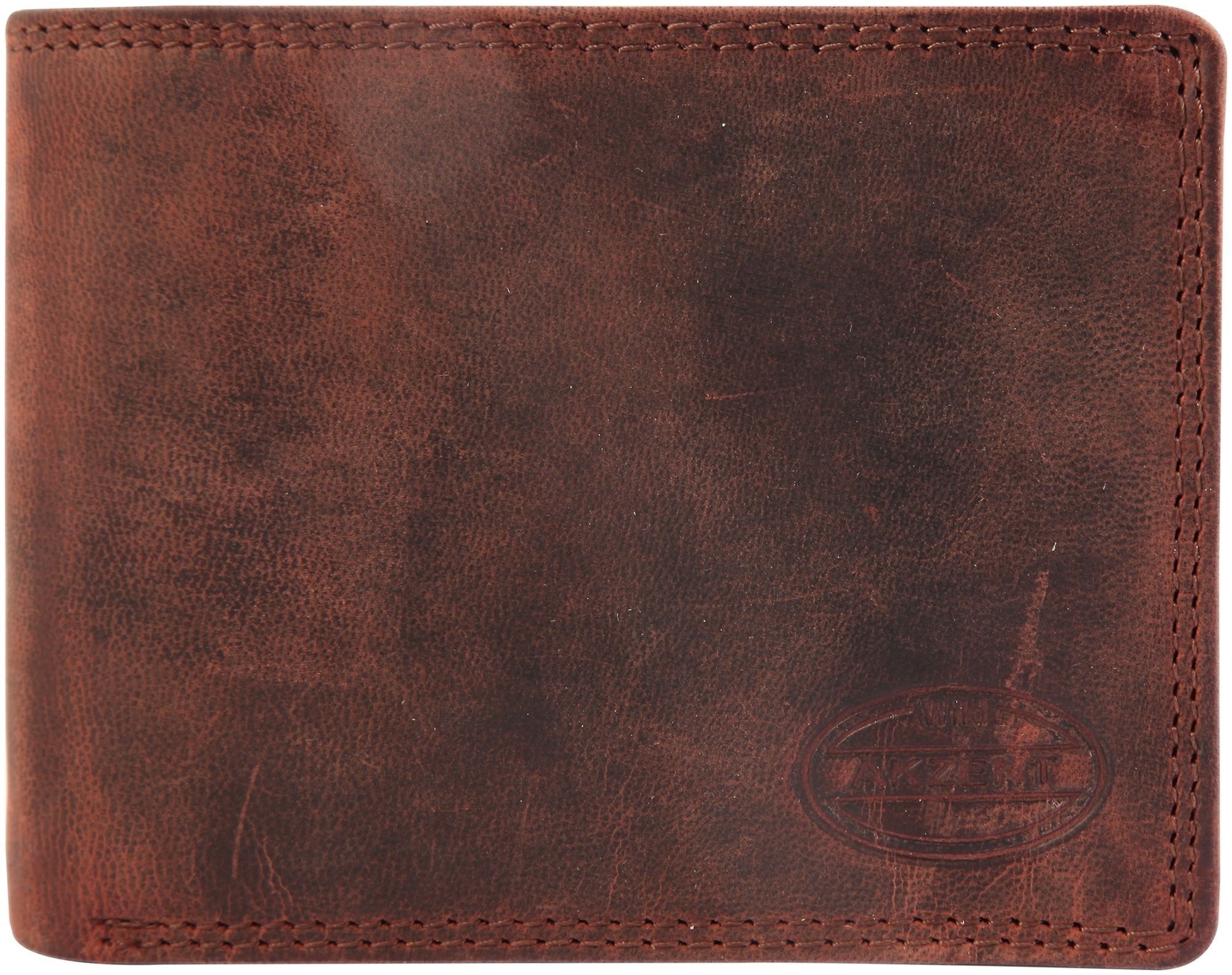 Akzent Herren Geldbörse aus Echtleder. Die Querformat-Geldbörse ist 13 cm breit und 10 cm hoch. Die Farbe ist Dunkelbraun. Sie verfügt über 2 Geldscheinfächer, ein Kleingeldfach, 12 Kreditkartenfächer, und ein transparentes Ausweisfach.