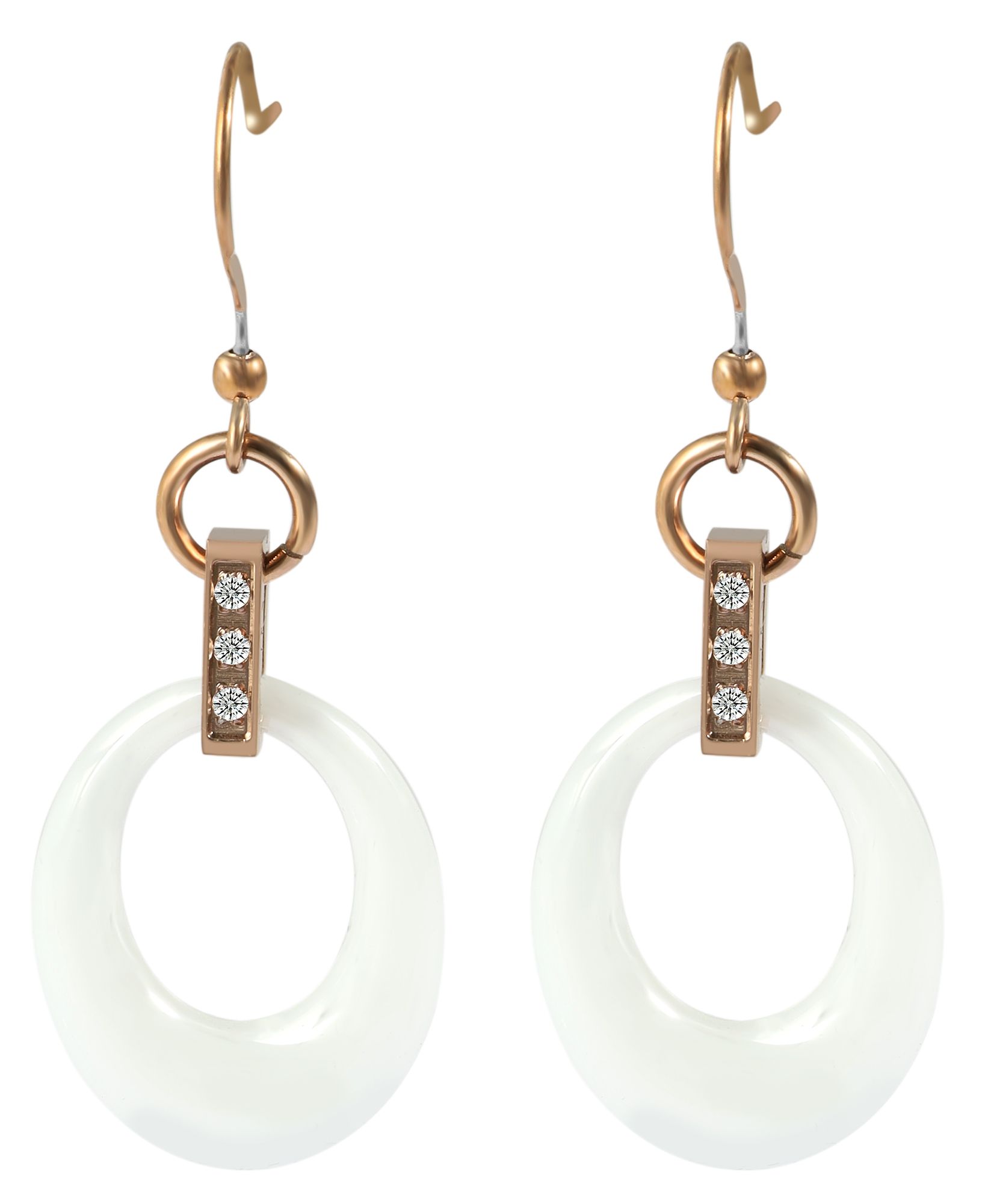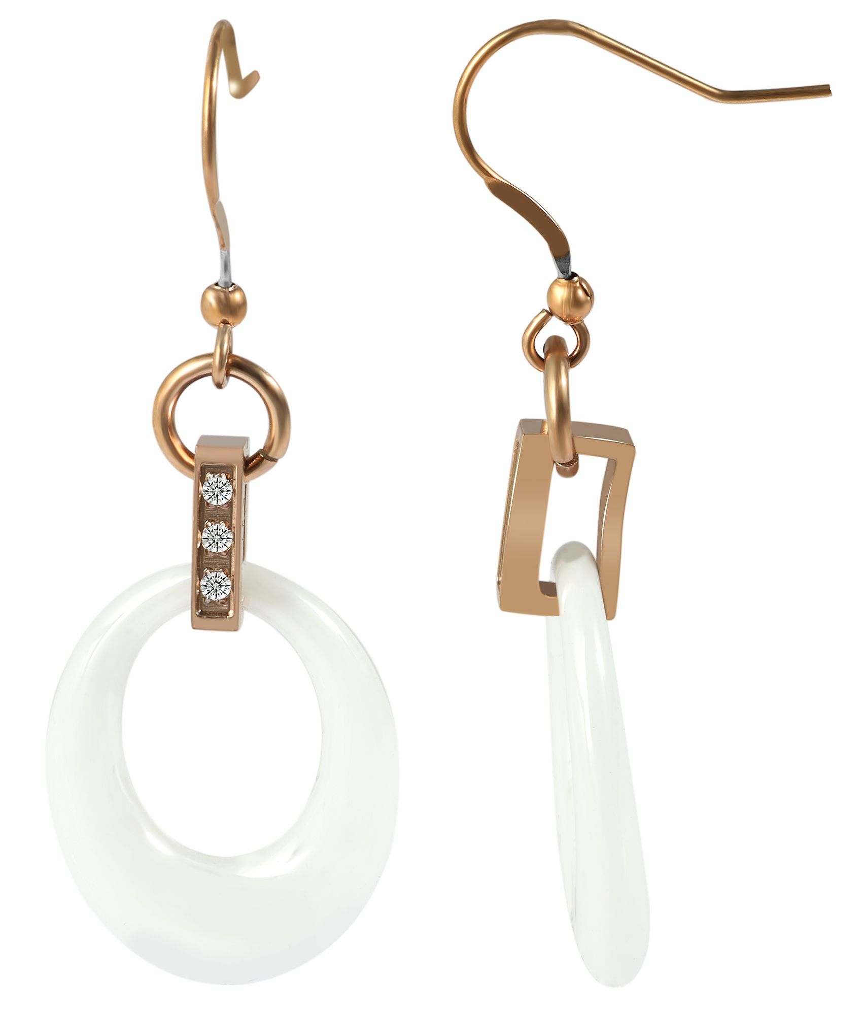 Akzent aus Keramik und Edelstahl. Die Beschichtung besteht aus IP Roségold. Die Farbe ist Weiß. Die Beschaffenheit zeigt sich in Edelstahl glänzend. Der Artikel hat folgende Abmessungen: Breite 4 mm, Höhe 3,8 cm. Aufgewertet wird der Ohrschmuck mit Zirkonia Steinen in Weiß.