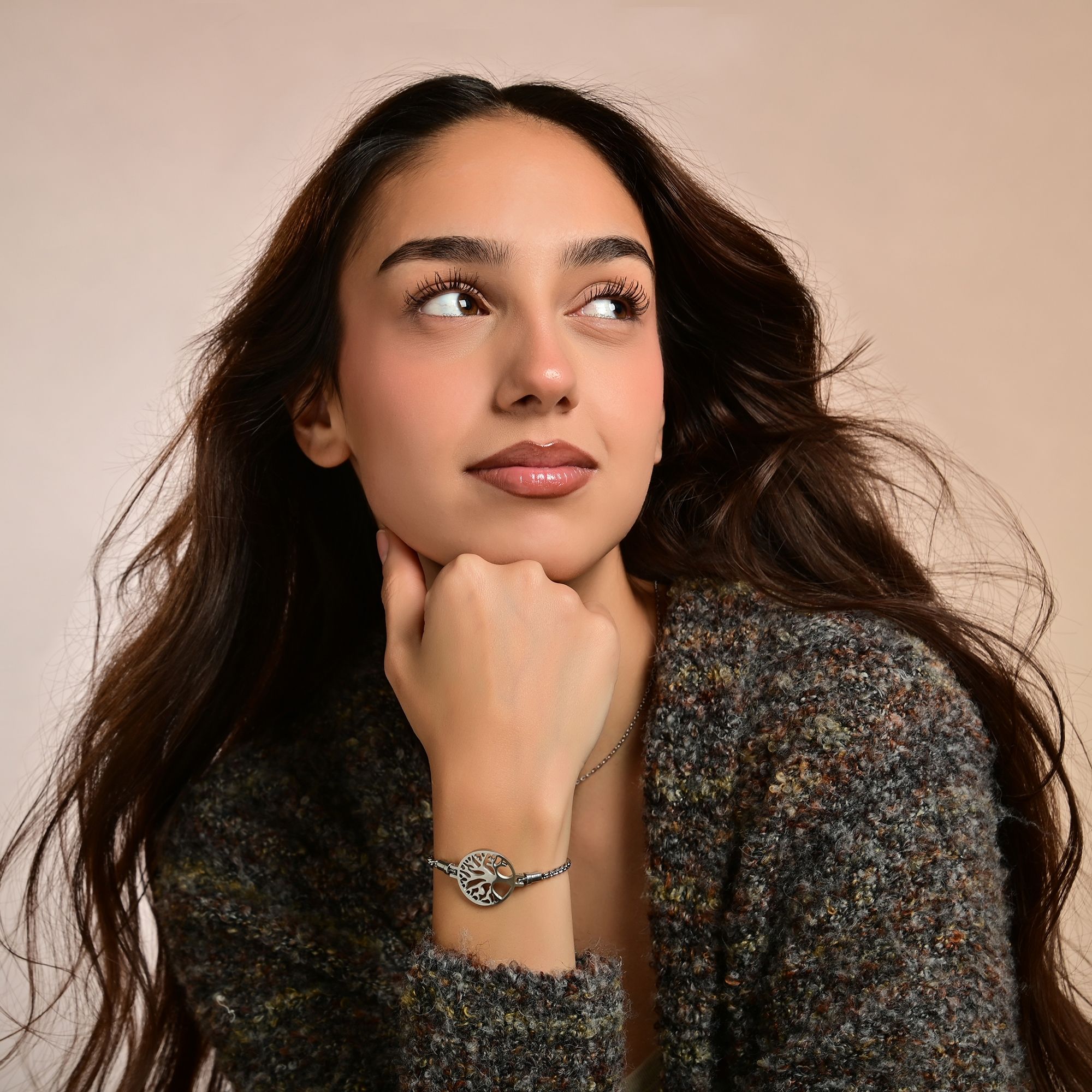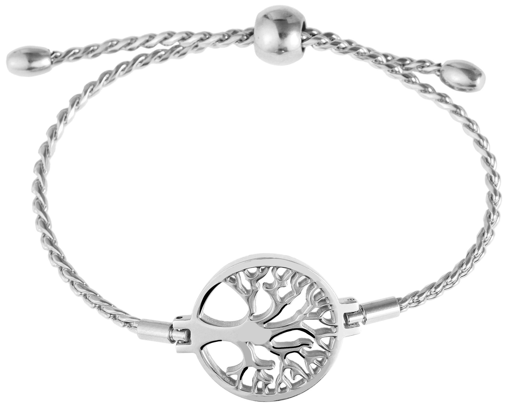 Das silberfarbene Kettenarmband der Marke Akzent ist aus Edelstahl gefertigt. Die Beschaffenheit ist in Edelstahl matt und glänzend gehalten. Es ist 20 cm lang. Öffnen und schließen lässt sich das schlichte Armband durch einen Ziehverschluss, der ebenfalls aus Edelstahl gefertigt ist. Blickfang ist der Lebensbaum in der Mitte des Armbandes. Der Durchmesser des Armbandes beträgt 80 mm. Die Breite beträgt 2 mm.