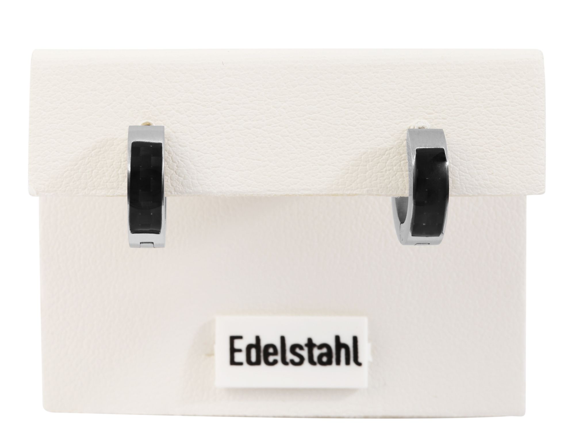 Die Creolen der Marke Akzent wurden aus Edelstahl gefertigt und präsentieren sich in mattierter Optik. Zusätzlich werden sie auf der Front mit Carbonoptik verziert. Dadurch erhalten Sie die Möglichkeit zweier Präsentationsmöglichkeiten am Ohrloch, denn die Rückseite des Ohrschmucks ist schlicht gehalten. Der Verschluss ist ein praktischer Klappverschluss aus Edelstahl, der ein leichthändiges An-und Ablegen garantiert und für sicheren Halt am Ohrloch sorgt. Die Creolen haben einen Durchmesser von 9 mm, eine Breite von 4 mm und eine Stärke von 2,5 mm. Dieses Produkt wird auf einem weißen Schmuckkärtchen geliefert. Es hat eine Maße von 38 x 55 mm und eignet sich ideal zum Präsentieren in dem dazu geeigneten Display oder zum Verpacken als Geschenk.
