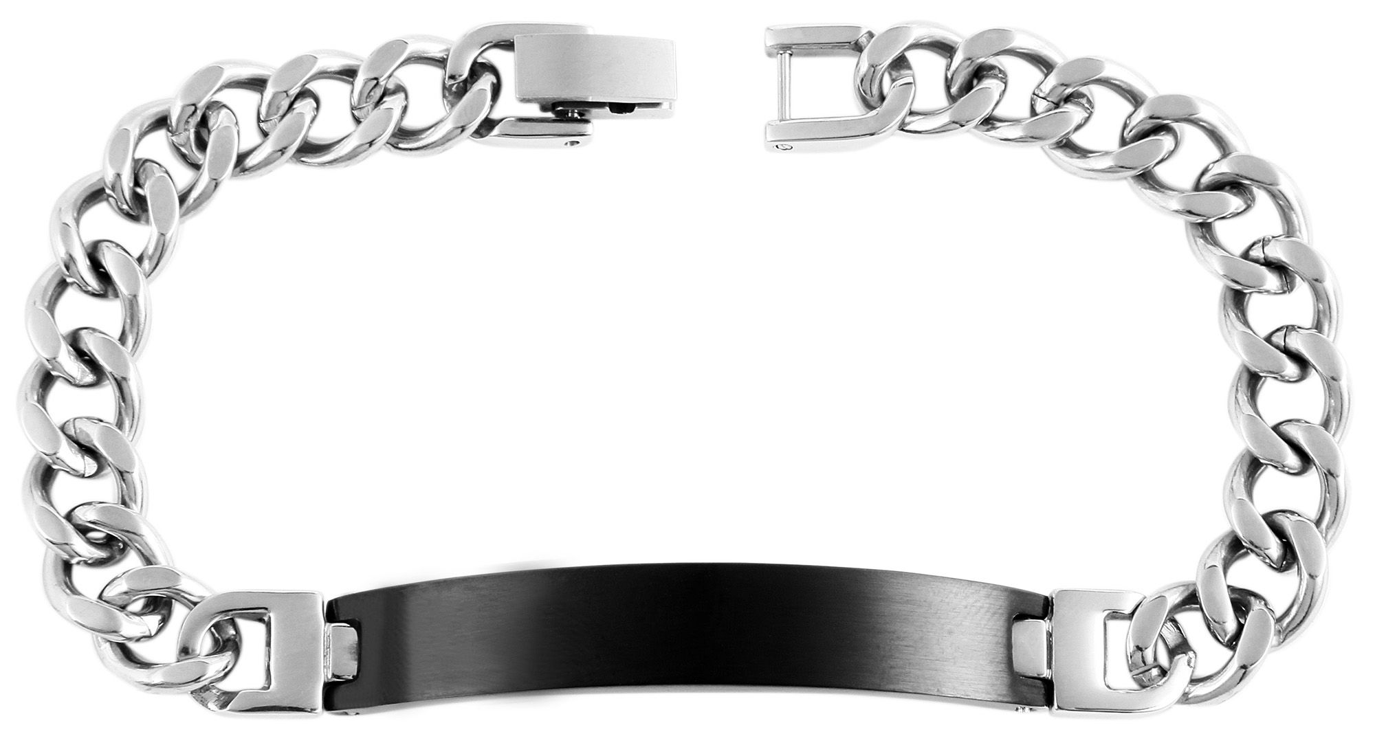 Das silberfarbene Panzerarmband der Marke Akzent ist aus Edelstahl gefertigt und fasst mittig eine 4,1 cm lange schwarze Gravurplatte. Die Maße ergeben sich aus einer Gesamtlänge von 21 cm, einer Breite von 0,8 cm und einer Materialstärke von 3 mm. Die Gravurplatte ist 2,5 mm stark und ebenfalls 0,8 cm breit. Öffnen und schließen lässt sich das massive Armband mit einem Karabinerhaken, der ebenfalls aus Edelstahl gefertigt ist. Die Oberfläche des auffälligen Schmuckstückes ist hochglanzpoliert. Die Gravurplatte, oder Identplatte, ist mattiert und dazu geeignet mit Gravuren versehen zu werden. Ein personalisiertes Schmuckstück eignet sich hervorragend als Geschenk.