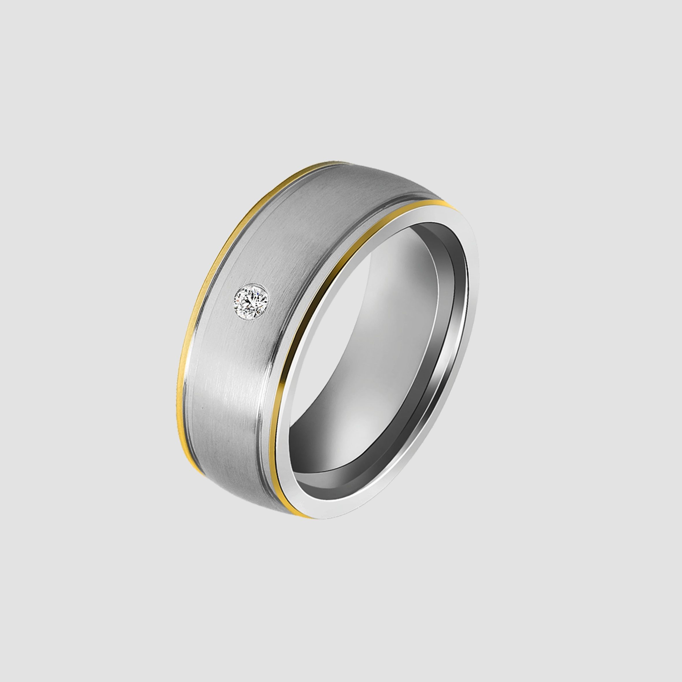 Der Damenring wurde aus Edelstahl gefertigt. Die Innenseite des Ringes ist eine leicht abgerundet und die Außenseite leicht gewölbt. Verziert ist der Ring mit vielen kleinen Details. Durch kleine Fräsungen ist der Ring in verschiedene Bereichen getrennt. Die äußersten Flächen des Ringes sind goldfarbig Hochglanz poliert. Die 5 mm breite silber farbige MIttelfläche ist Quer mattiert Ein weiterer Hingucker ist der kleine Similistein mit einem Durchmesser von 2 mm. Die Ringgröße beträgt 52 und hat einen Ringdurchmesser von 16,6 mm. Das passende Herrenmodell ist hat die Artikelnummer 5080100