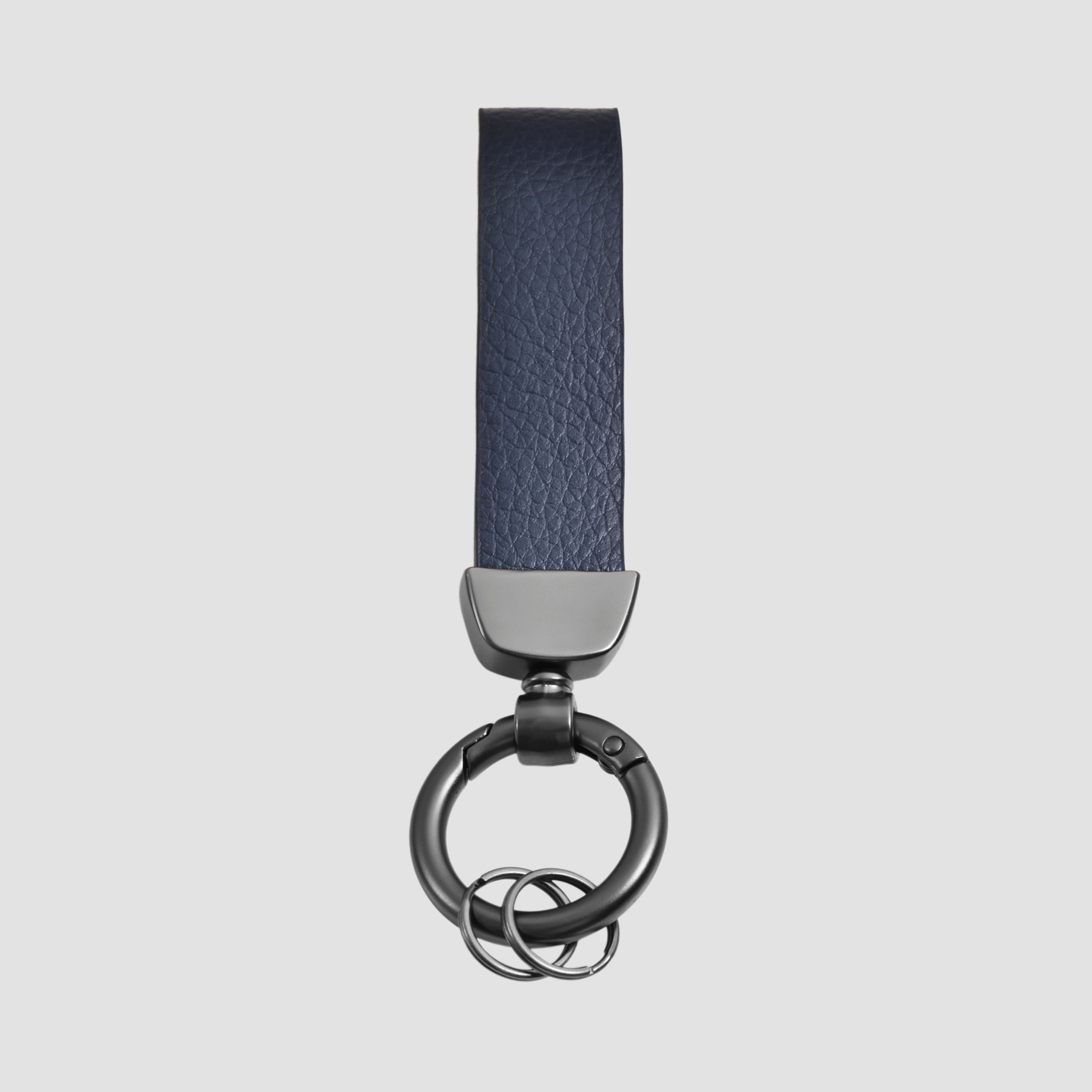 Der Schlüsselanhänger der Marke Akzent besteht aus einem dunkelblauen Echtlederriemen, einem anthrazitfarbenen Karabinerring und zwei anthrazitfarbenen Schlüsselringen aus Edelstahl. Der Lederriemen ist mit zwei kleinen Schrauben an einem Edelstahlelement verschraubt. Dies gewährt den nötigen Halt, wodurch das Ausreißen verhindert wird. Der Karabinerring hat einen Durchmesser von 25 mm und eine Stärke von 5 mm. Die Schlüsselringe haben einen Durchmesser von 13 mm und eine Stärke von 1,5 mm. Der Lederriemen ist 7,5 cm lang und 2,2 cm breit. Der Schlüsselanhänger hat eine Gesamtlänge von 13 cm, die breiteste Stelle liegt bei 3,5 cm und die Materialstärke ist 0,9 cm dick. Durch sein schlichtes Design ist der Schlüsselanhänger ein Must Have an jedem Schlüsselbund und eignet sich hervorragend zum Verschenken.