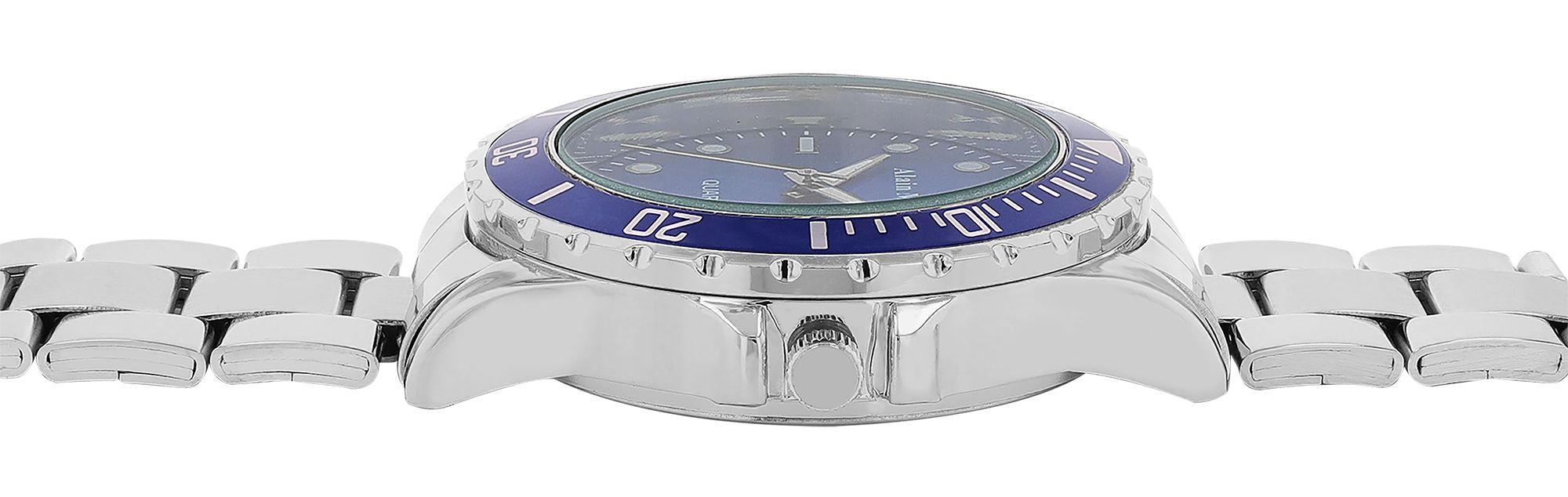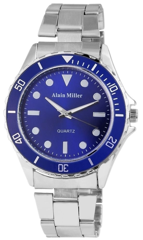 Die analoge 3-Zeiger Herrenarmbanduhr der Marke Alain Miller verfügt über ein hochwertiges Quarzuhrwerk. Das silberfarbige Edelstahlarmband ist im Anstoß 20 mm breit und lässt sich über eine Edelstahlfaltschließe öffnen und schließen. Die Gesamtlänge der Uhr beträgt 21,5 cm. Das silberfarbene Metallgehäuse mit Mineralglas hat eine Abmessung von 44 mm im Durchmesser und einer Gehäusehöhe von 11 mm. Der Gehäuseboden ist aus Edelstahl gefertigt. Durch die mit Superluminova beschichteten Zeiger, Strich- und Punktindexe lässt sich auch im Dunkeln die Uhrzeit gut auf dem blauen Zifferblatt ablesen. Aufgrund des leichten Gewichtes bietet die Armbanduhr einen angenehmen Tragekomfort.
