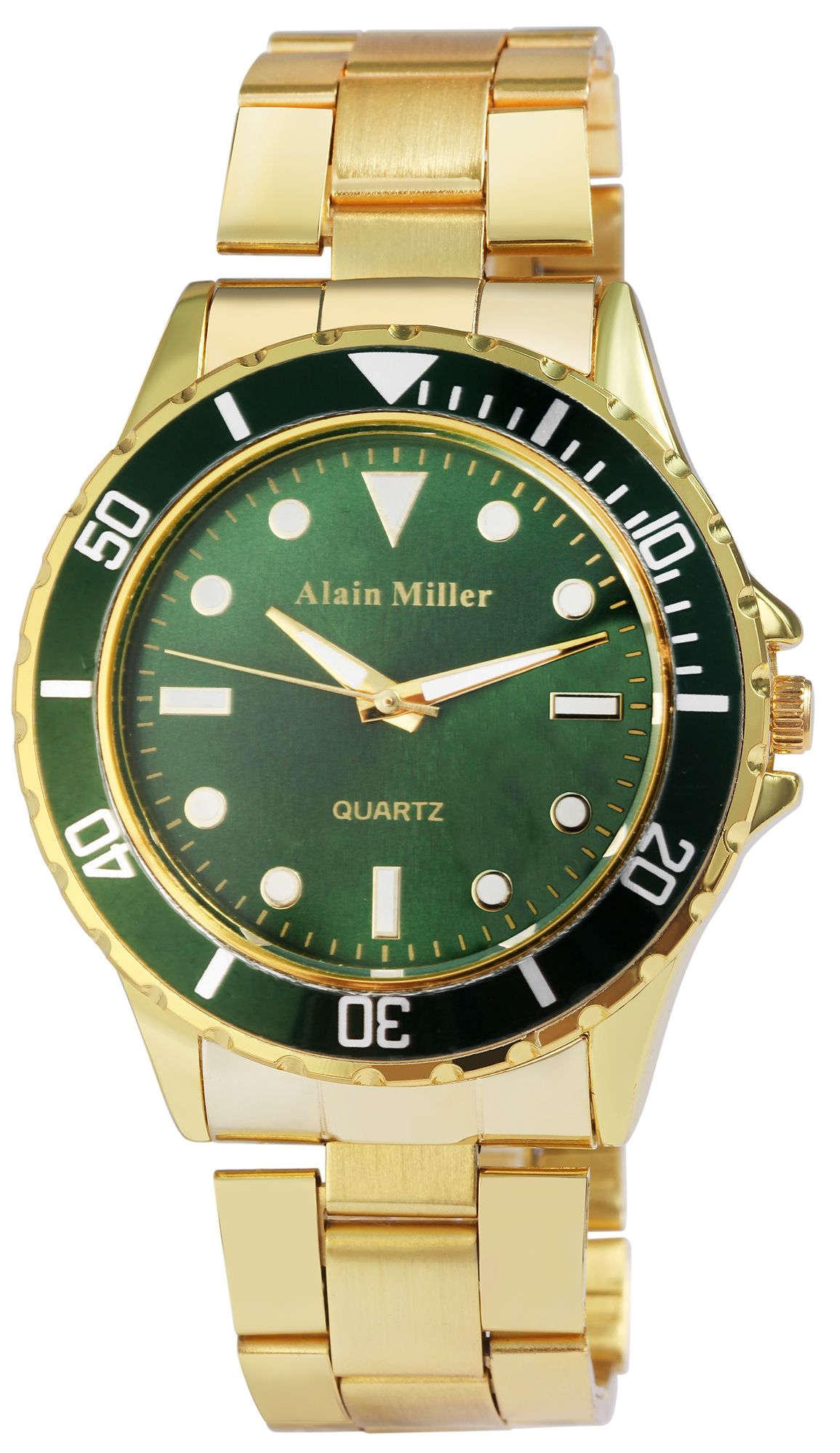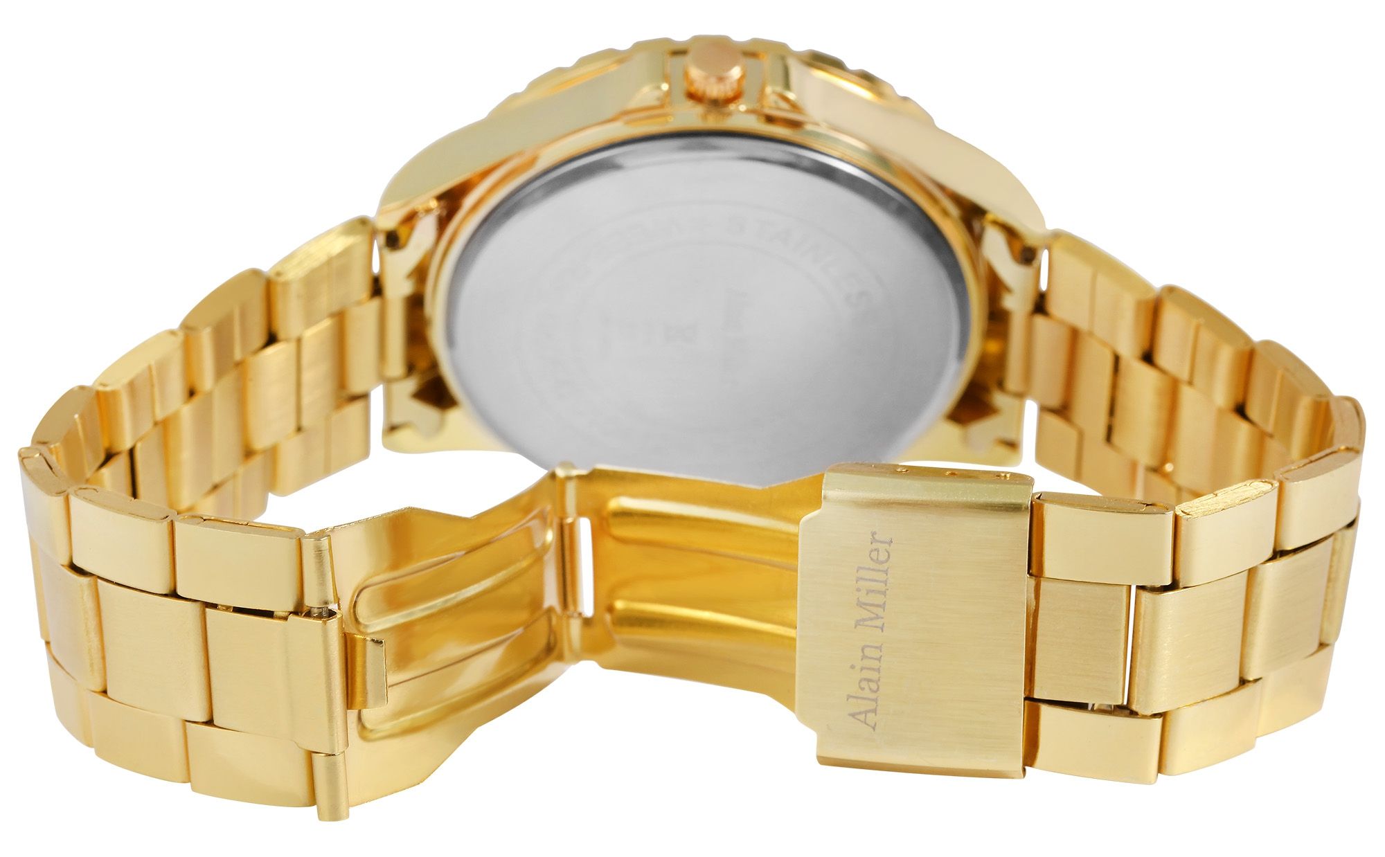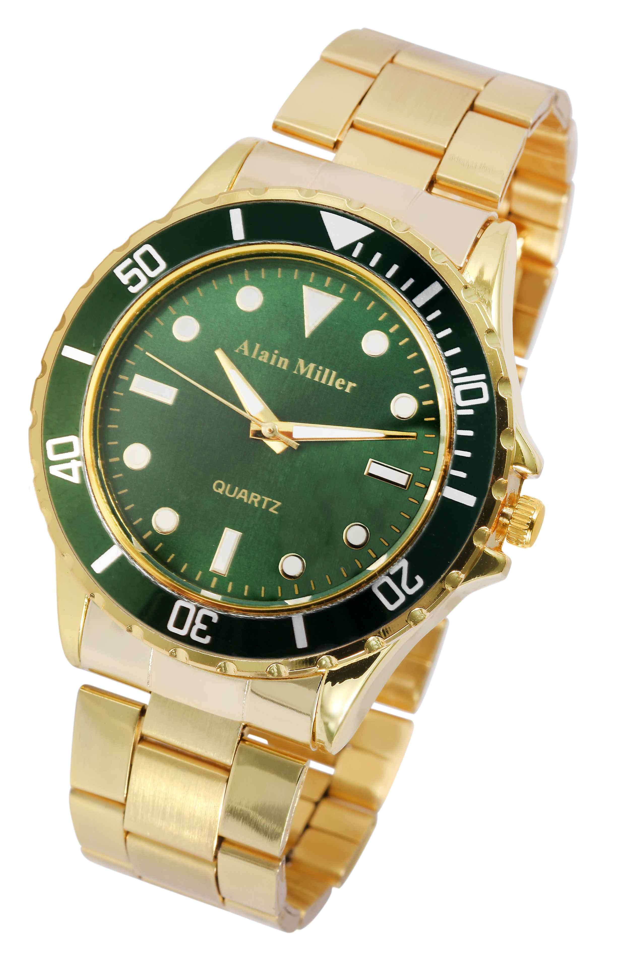 Die analoge 3-Zeiger Herrenarmbanduhr der Marke Alain Miller verfügt über ein hochwertiges Quarzuhrwerk. Das goldfarbene Edelstahlarmband ist im Anstoß 20 mm breit und lässt sich über eine Edelstahlfaltschließe öffnen und schließen. Die Gesamtlänge der Uhr beträgt 21,5 cm. Das Metallgehäuse mit Mineralglas hat eine Abmessung von 44 mm im Durchmesser und einer Gehäusehöhe von 11 mm. Der Gehäuseboden ist aus Edelstahl gefertigt. Durch die mit Superluminova beschichteten Zeiger, Strich- und Punktindexe lässt sich auch im Dunkeln die Uhrzeit gut ablesen. Aufgrund des leichten Gewichtes bietet die Armbanduhr einen angenehmen Tragekomfort.