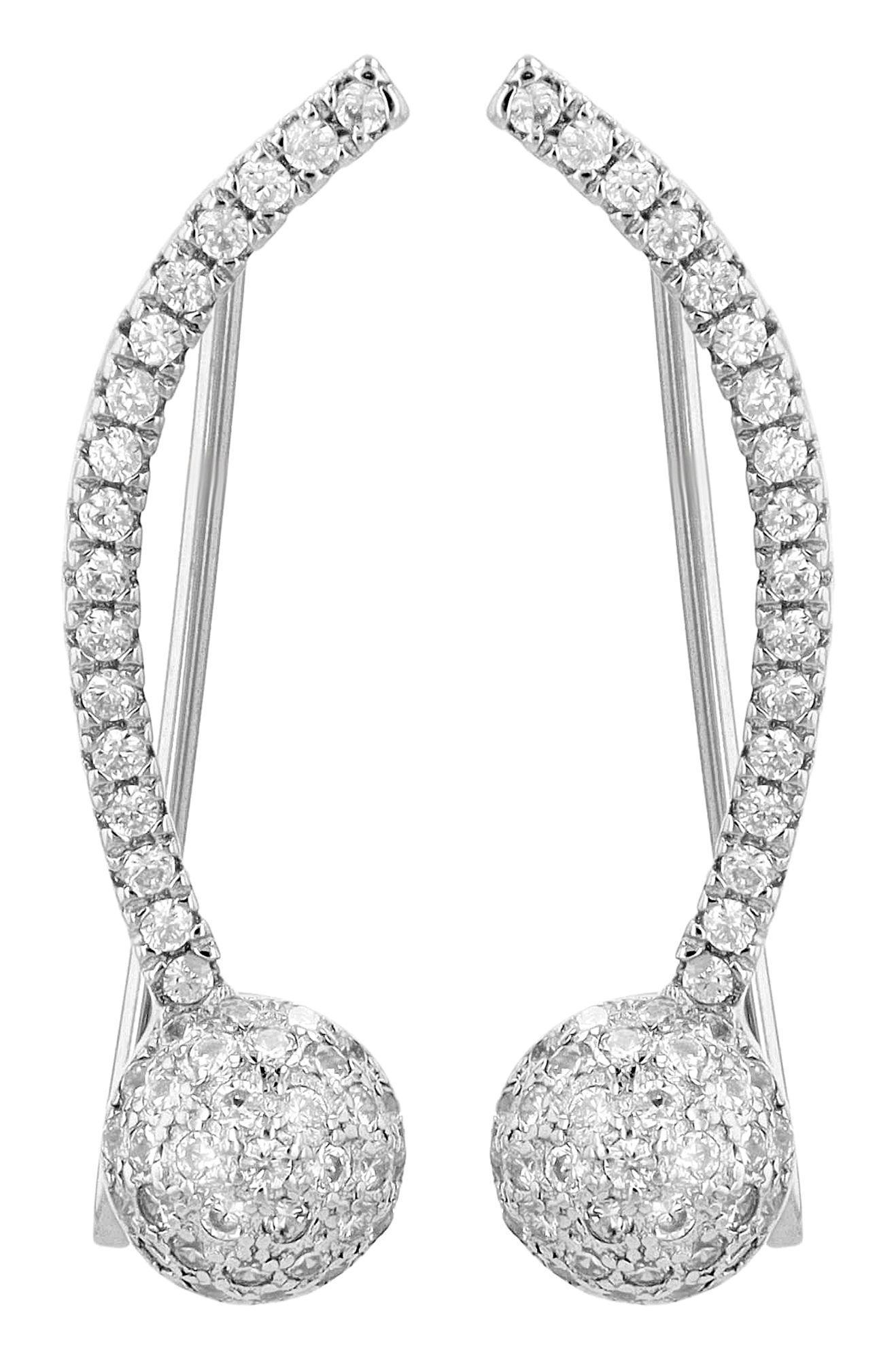Dieser exquisite Schmuck aus rhodiniertem 925/- Echtsilber besticht durch seine markante Formsprache und sein luxuriöses Strahlen. Insgesamt 102 weiße Zirkoniasteinchen im präzisen Rundschliff sind kunstvoll in ein bogenförmiges Element eingefasst, das in einer edlen Halbkugel endet. Ein Design, das Sie und Ihren Abend zum Funkeln bringen wird.
