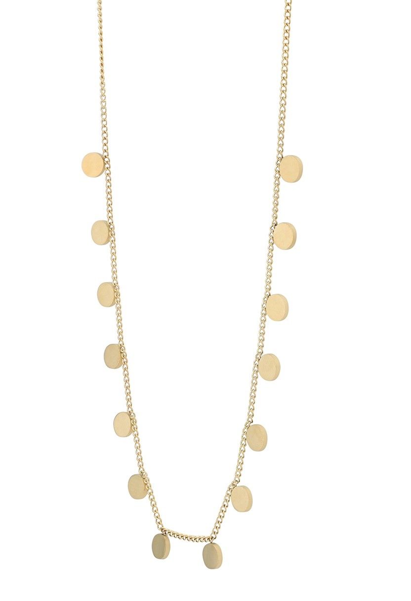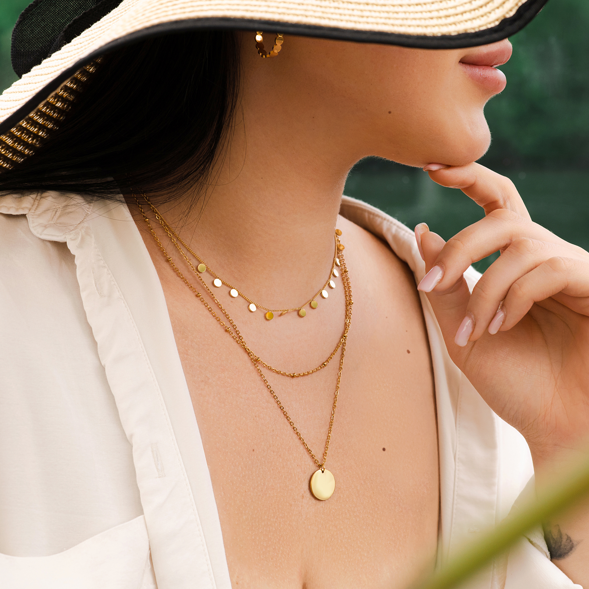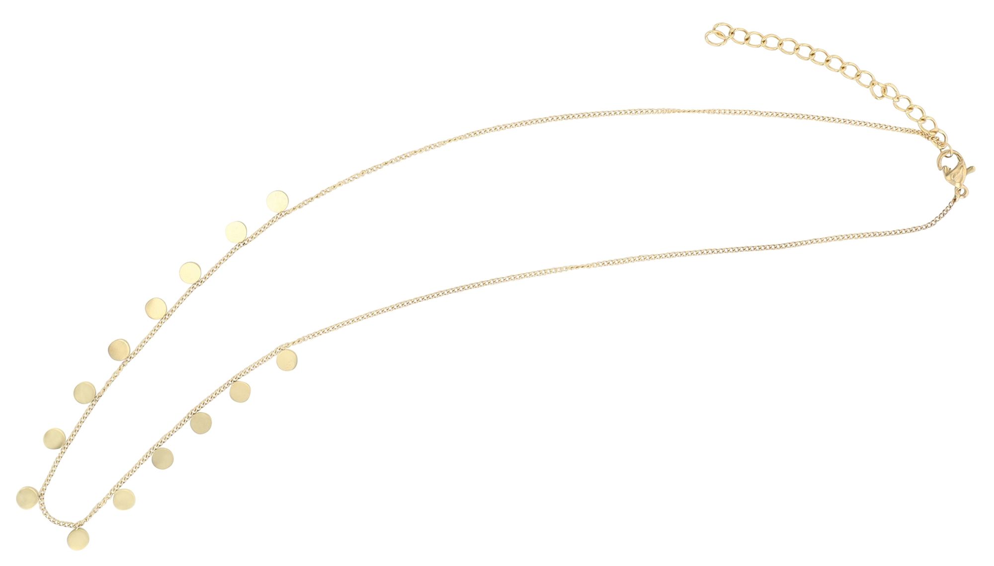 Das Herzstück dieser Kette sind die 14 kleinen runden Plättchen, jeder mit einem Durchmesser von 4 mm sind diese mittig an der Kette in einem Bereich von 13 cm angebracht. Diese filigranen Plättchen verleihen der "Amar" Kette eine subtile und dennoch auffällige Ausstrahlung, perfekt für den Sommer-Look.