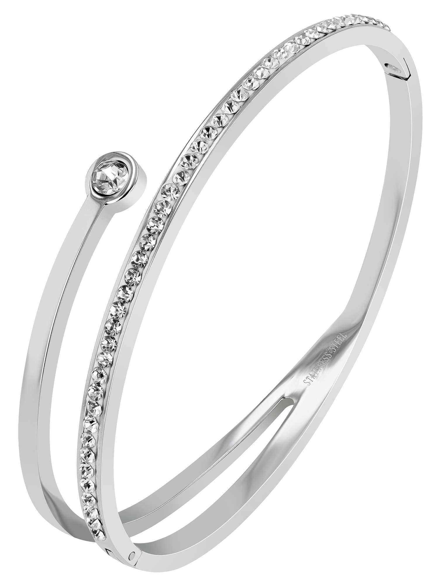 Der Armreif der Marke Akzent wurde aus hochwertigem Edelstahl gefertigt. Er besteht aus einem geschlossenen Armreif der eine Breite von 3,5 mm hat sowie einem halbrunden Reif mit einer Breite von 2,5 mm. Der breitere Reif ist mit 48 Similisteinen besetzt. Die gesamte Oberfläche des Armreifes ist hochglanzpoliert. Das Ende des Halbreifs ziert ein größerer Similistein.