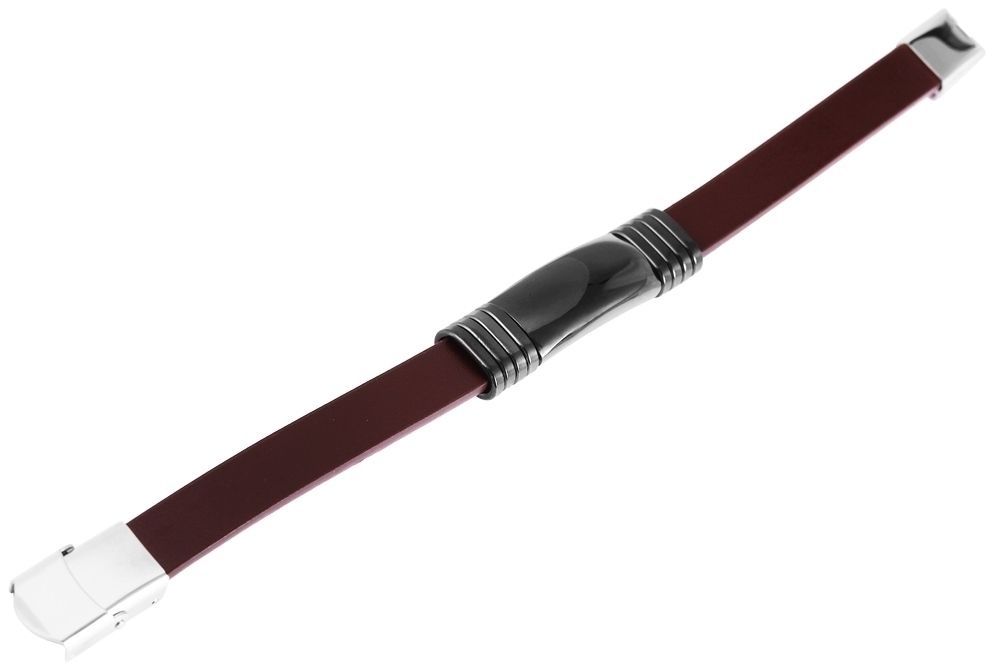 Das dunkelbraune Echtlederarmband der Marke Akzent besteht aus einem 10 mm breiten, glatten Lederriemen. Mittig ist ein 2,9 cm langes schwarzes Edelstahlelement eingearbeitet. Dieses ist mit jeweils vier gleichfarbigen ovalen Edelstahlringen umrandet. Diese runden das harmonische Gesamtbild des modischen Schmuckarmbandes ab. Öffnen und schließen lässt sich das Armband mit einem silberfarbenen glänzenden Hakenverschluss. Die Gesamtlänge des Schmuckstückes beträgt 21 cm, die Breite der Gravurplatte 13 mm und die Materialstärke 8 mm.