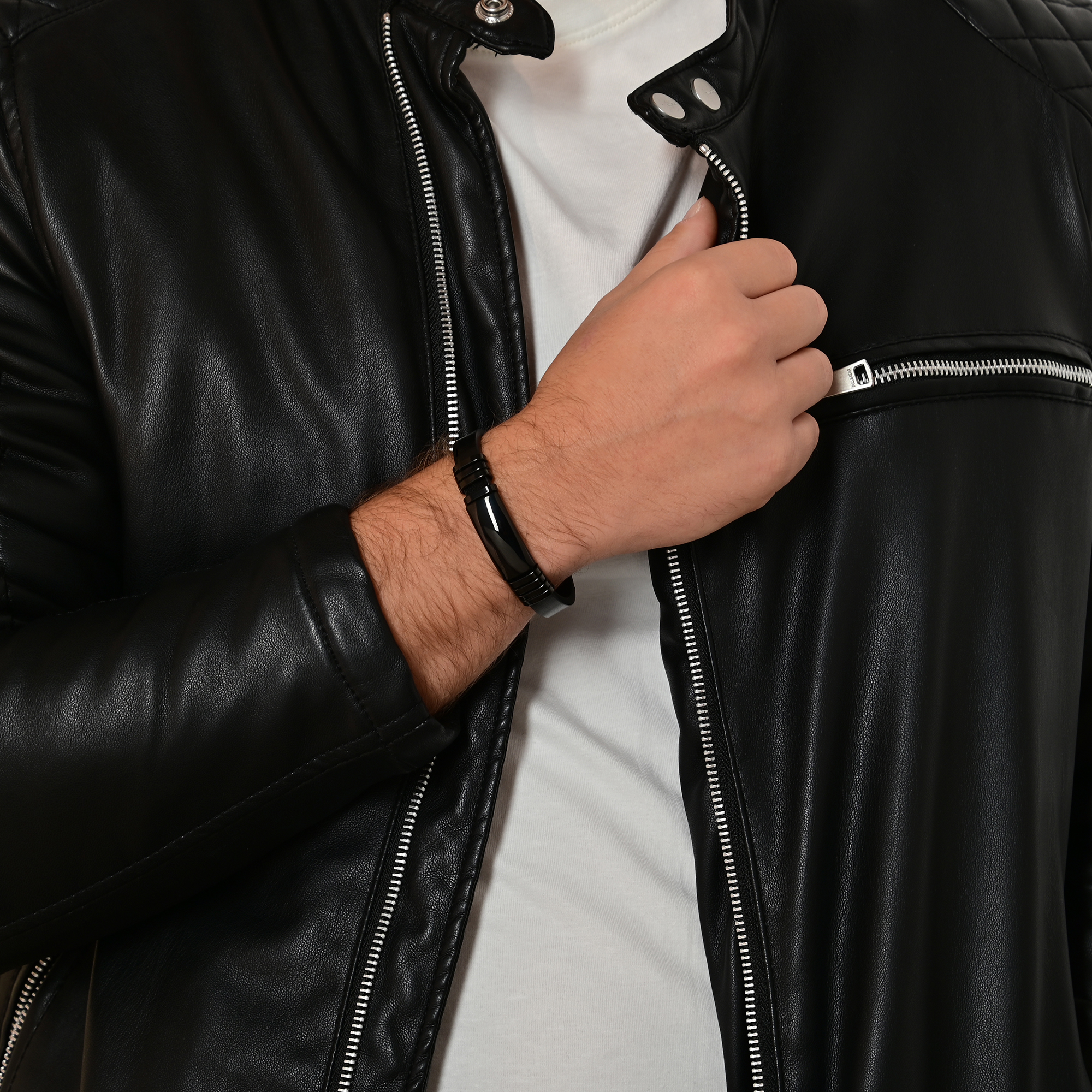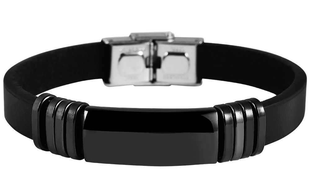 Das schwarze Echtlederarmband der Marke Akzent besteht aus einem 10 mm breiten, glatten Lederriemen. Mittig ist ein 2,9 cm langes schwarzes Edelstahlelement eingearbeitet. Dieses ist mit jeweils vier gleichfarbigen ovalen Edelstahlringen umrandet. Diese runden das harmonische Gesamtbild des modischen Schmuckarmbandes ab. Öffnen und schließen lässt sich das Armband mit einem silberfarbenen glänzenden Hakenverschluss. Die Gesamtlänge des Schmuckstückes beträgt 21 cm, die Breite der Gravurplatte 13 mm und die Materialstärke 8 mm.