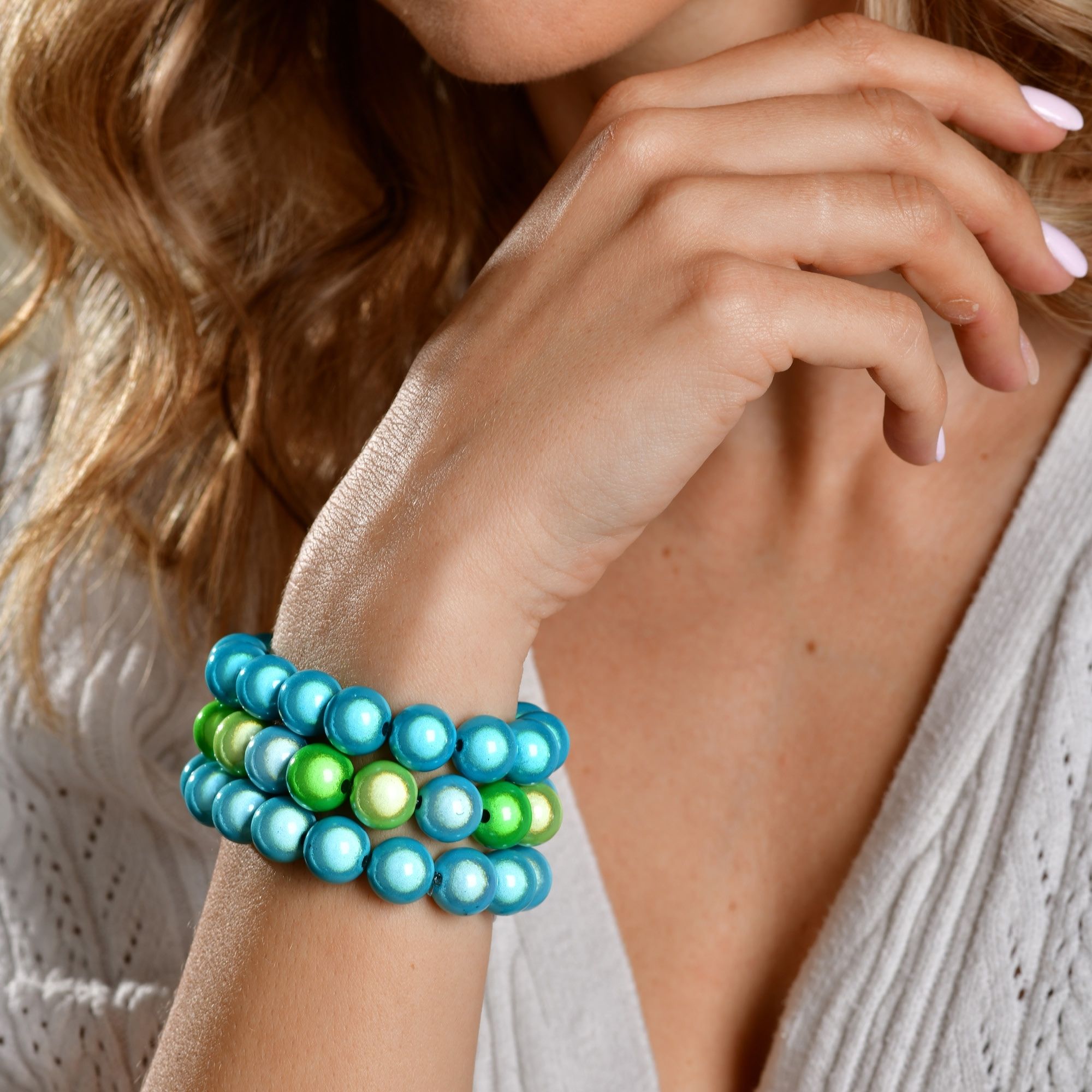 Dieses einzigartige Armband präsentiert 17 kunstvolle Kunststoffkugeln mit einem Durchmesser von 12 mm, die auf einer elastischen Schnur aufgereiht sind.