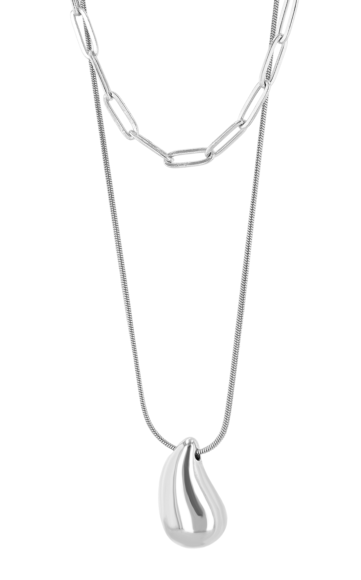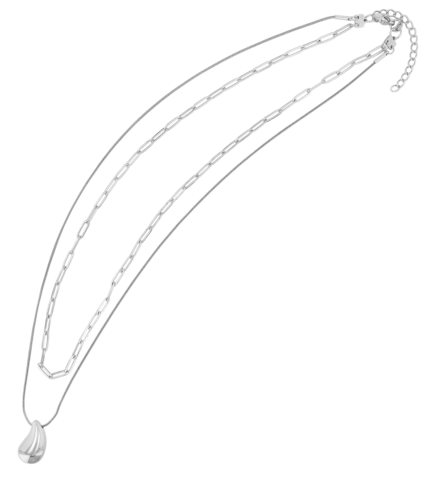 Eine glänzende Schlangenkette (50 cm lang, 1 mm Stärke) sorgt für eine geschmeidige und elegante Basis. Für den perfekten Kontrast sorgt eine Gliederkette (45 cm lang, 3 mm Breite). Ein eleganter Tropfen-Anhänger (18 x 11 x 9mm) rundet das Design stilvoll ab. Dank der kombinierten Längen und der Verlängerung von 5 cm passt die Kette immer perfekt zu jedem Outfit.