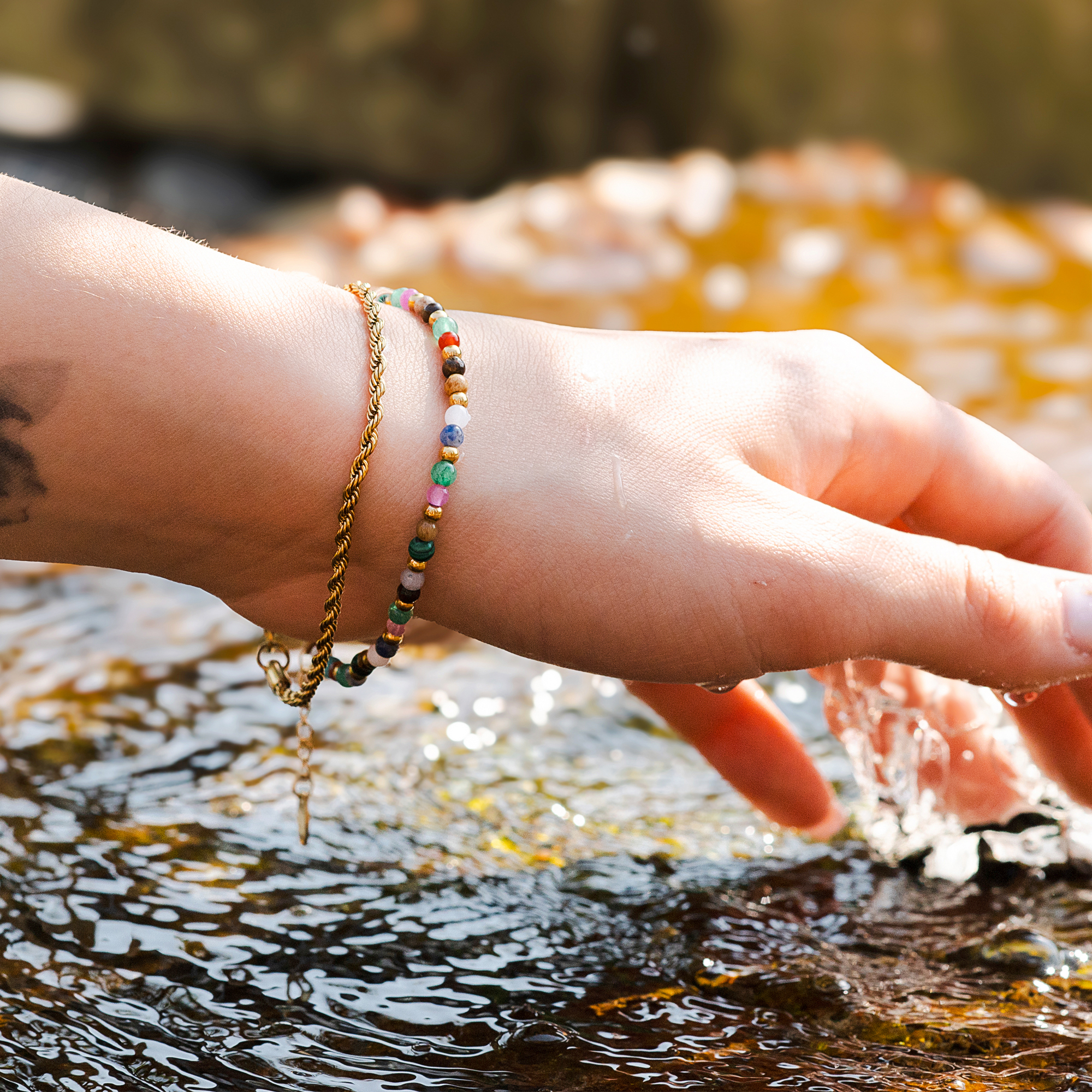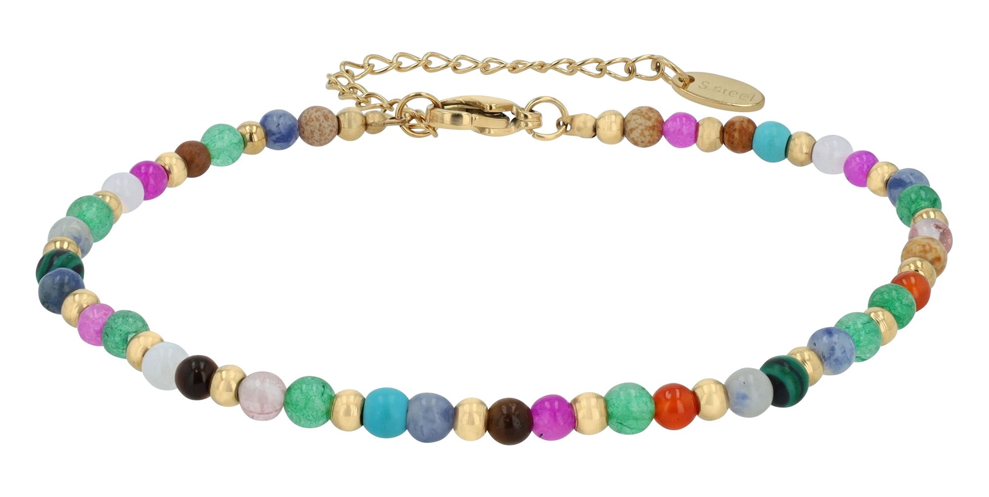 Gefertigt aus hochwertigem Edelstahl und veredelt mit farbigen Kunstperlen, verkörpert dieses Armband feminine Verspieltheit und anspruchsvolles Design. Es besticht mit einem Zusammenspiel aus farbenfrohen Kunstperlen mit einem Durchmesser von 3,5 mm, die in einem faszinierenden Farbspiel erstrahlen. Zwischen den Perlen zeigen sich Edelstahlkugeln, die eine subtile Eleganz verleihen.