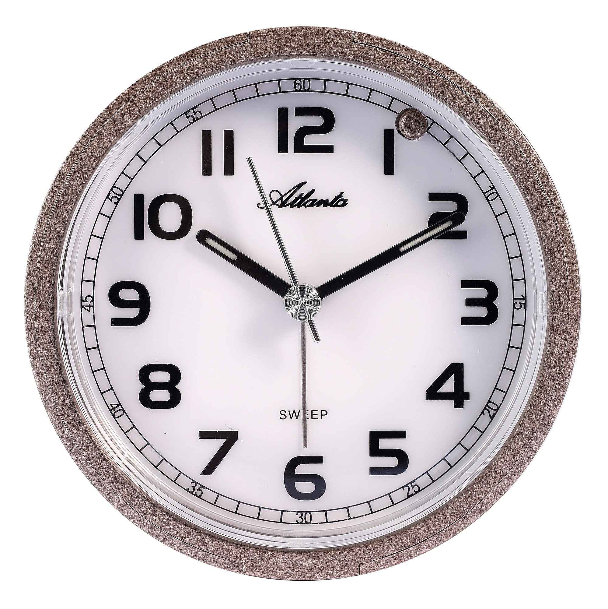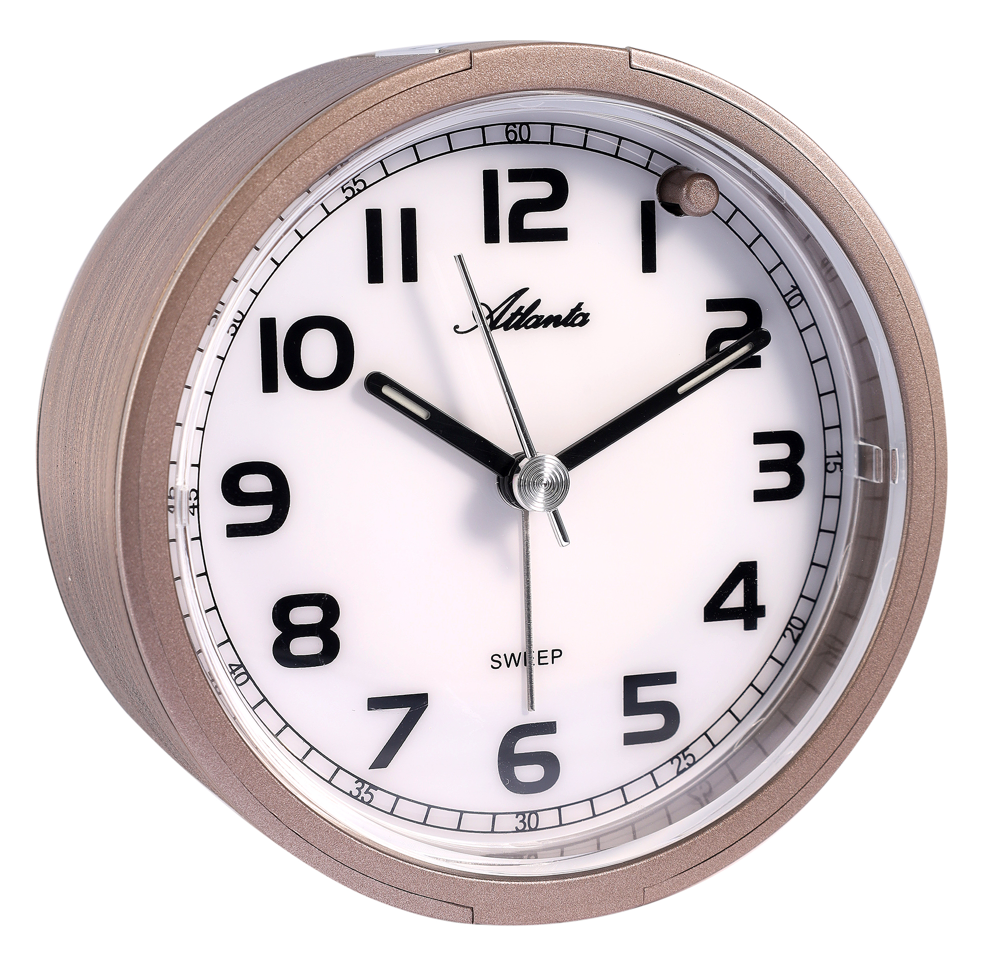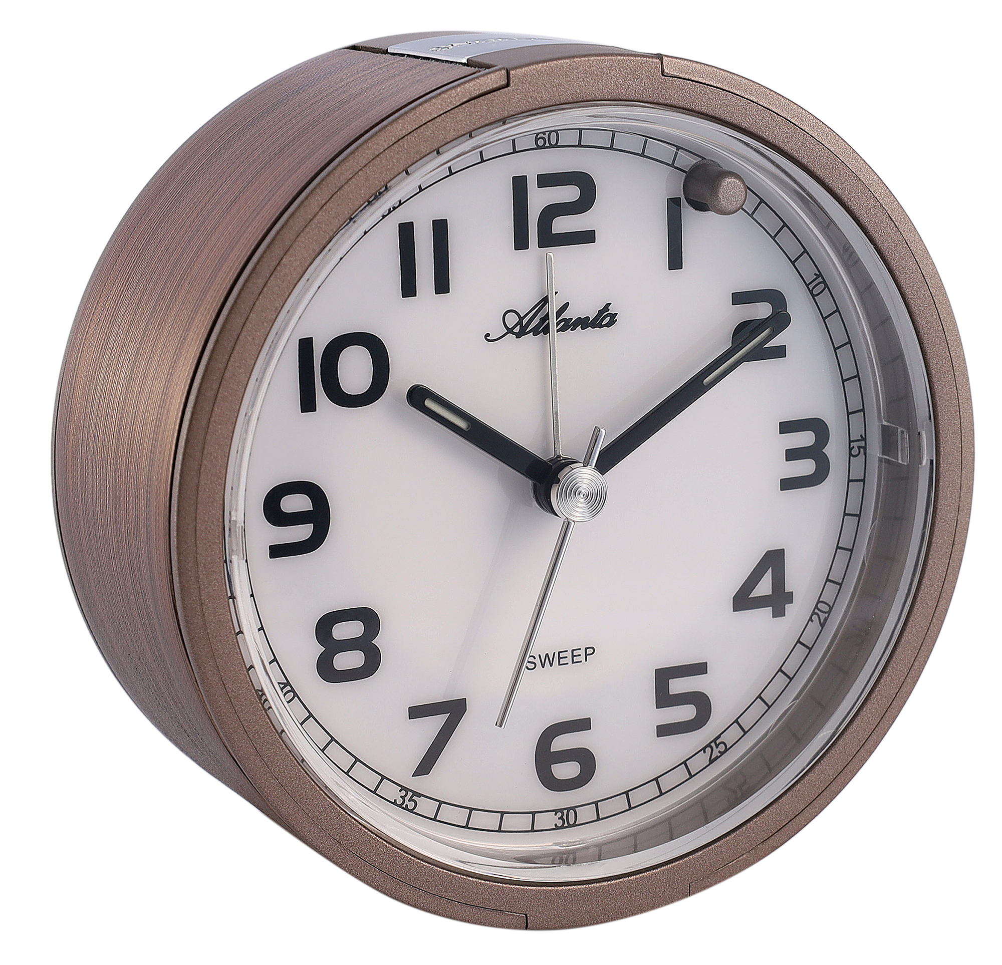 Atlanta Quarzwecker, kompakt, zuverlässig und dekorativ. Das Gehäuse in schimmerndem Kupfer-Braun macht ihn zum stilvollen Blickfang auf jedem Nachttisch.