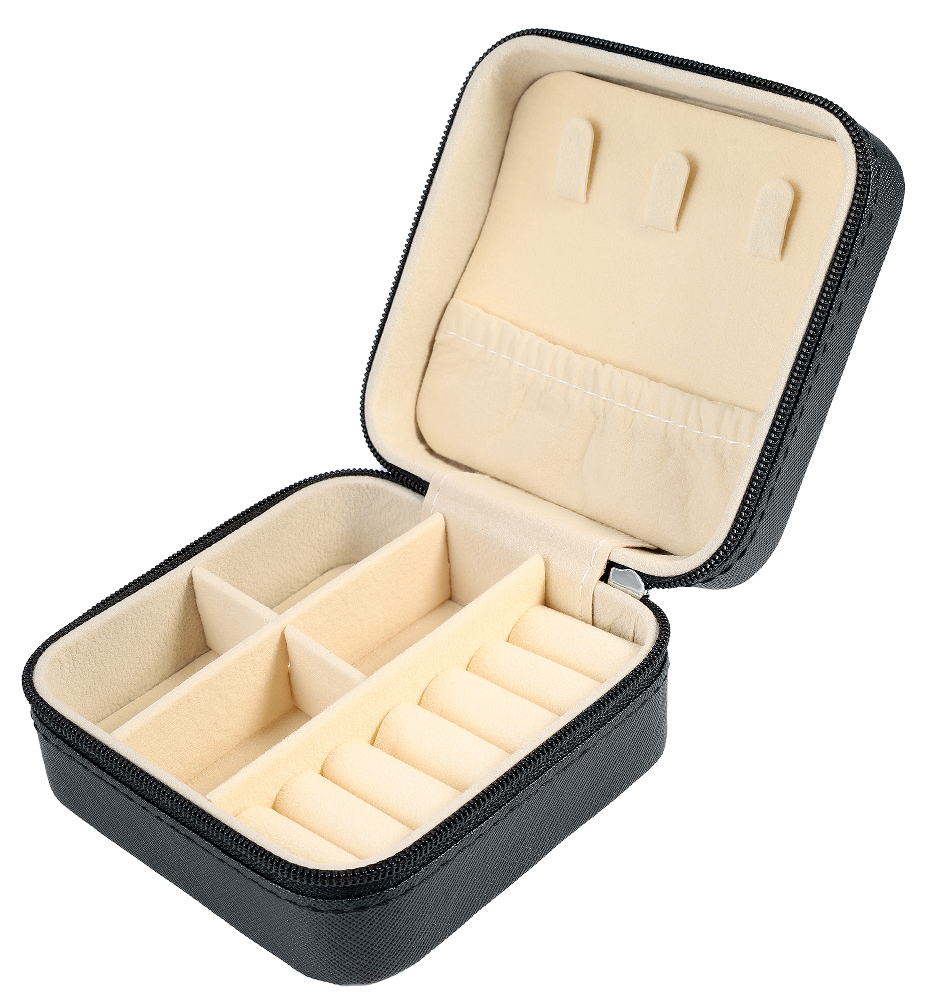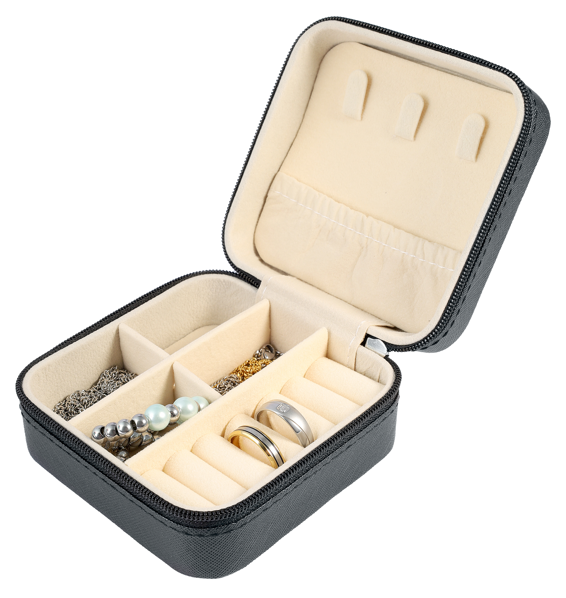 Die Aufteilung der Schmuckbox ist besonders praktisch. Sie untergliedert sich in eine Bodenseite für 6 Ringe sowie 4 Paar Ohrringe oder Armbänder und eine Oberseite für 3 Ketten mit oder ohne Anhänger, für deren sichere Aufbewahrung drei Haken sowie eine Tasche mit Gummizug sorgen. Ein Reißverschluss hält die Aufbewahrungsbox zusammen und verschließt sie sicher. Erhältlich ist dieser treue Begleiter in verschiedenen Farben.