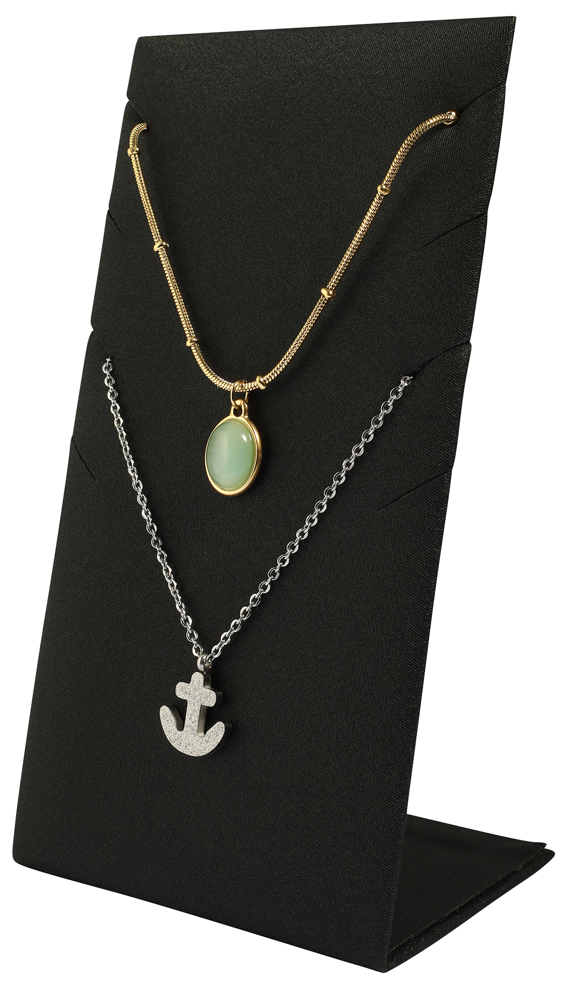 Dieser Aufsteller ist perfekt, um bis zu 4 Ketten stilvoll zu präsentieren. Eine kleine Tasche an der Rückseite sorgt dafür, dass die Kettenlängen sicher verstaut und die Optik stets ordentlich bleibt. Mit Maßen von nur 13,5 x 7 x 5 cm ist er ideal, um Ketten mit Anhängern gekonnt in Szene zu setzen.