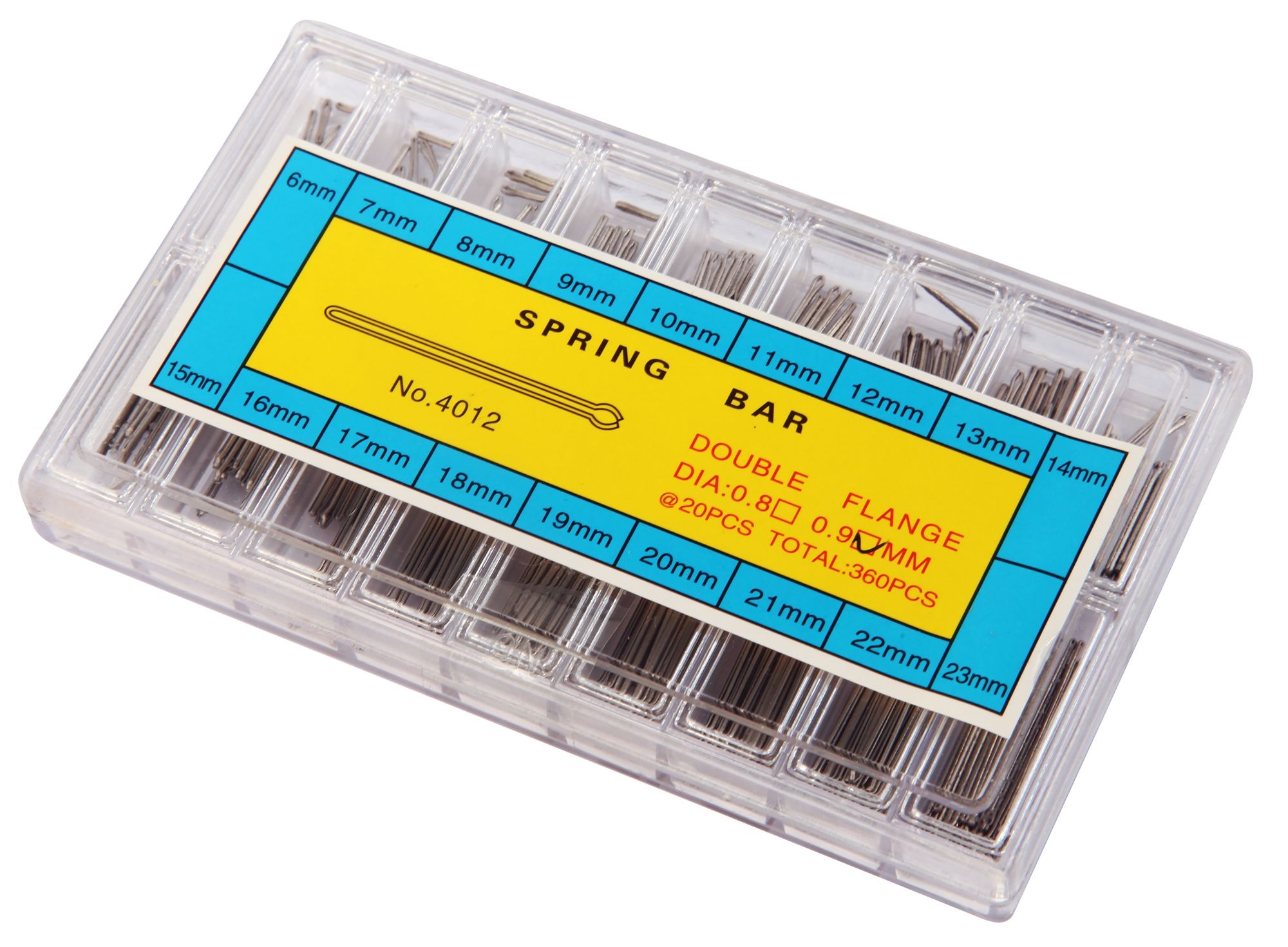 Das Bandsplintesortiment enthält 360 Bandsplinte in 18 verschiedenen Größen. Der kleinste Splint ist 6 mm lang, der größte Splint ist 23 mm lang. Dementsprechend sind alle anderen Splinte 7 mm, 8 mm, 9 mm, 10 mm, 11 mm, 12 mm, 13 mm, 14 mm, 15 mm, 16 mm, 17 mm, 18 mm, 19 mm, 20 mm, 21 mm und 22 mm lang. Der Durchmesser der Splinte beträgt 0,9 mm. Von jedem Splint sind 20 Stück enthalten. Die Splinte sind dazu geeignet, Elemente von Gliederarmbändern miteinander zu verbinden.