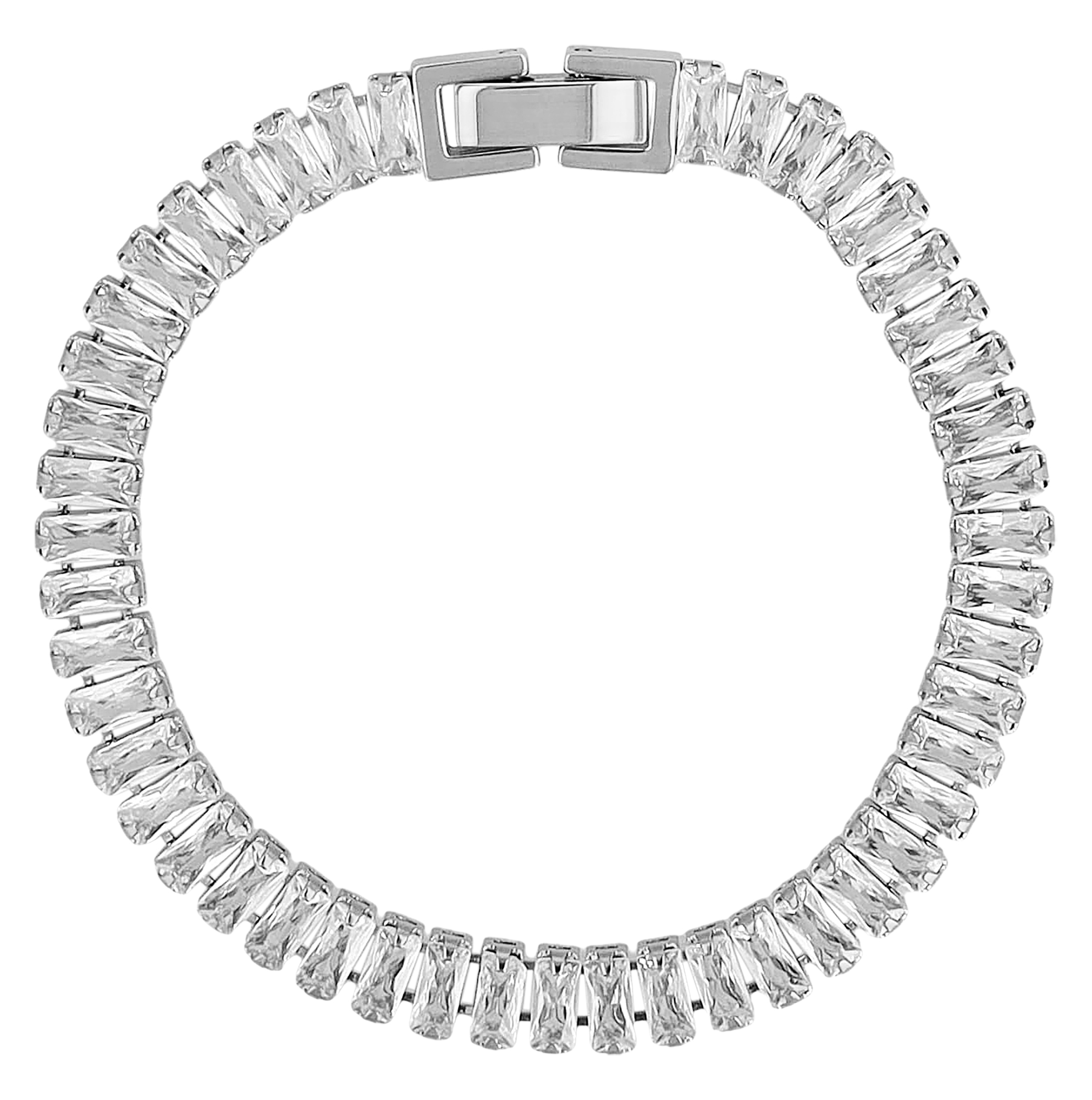 Die zahlreichen aneinander gereihten, baguetteförmigen weißen Zirkonia Steine verleihen dem Armband einen luxuriösen Glanz.