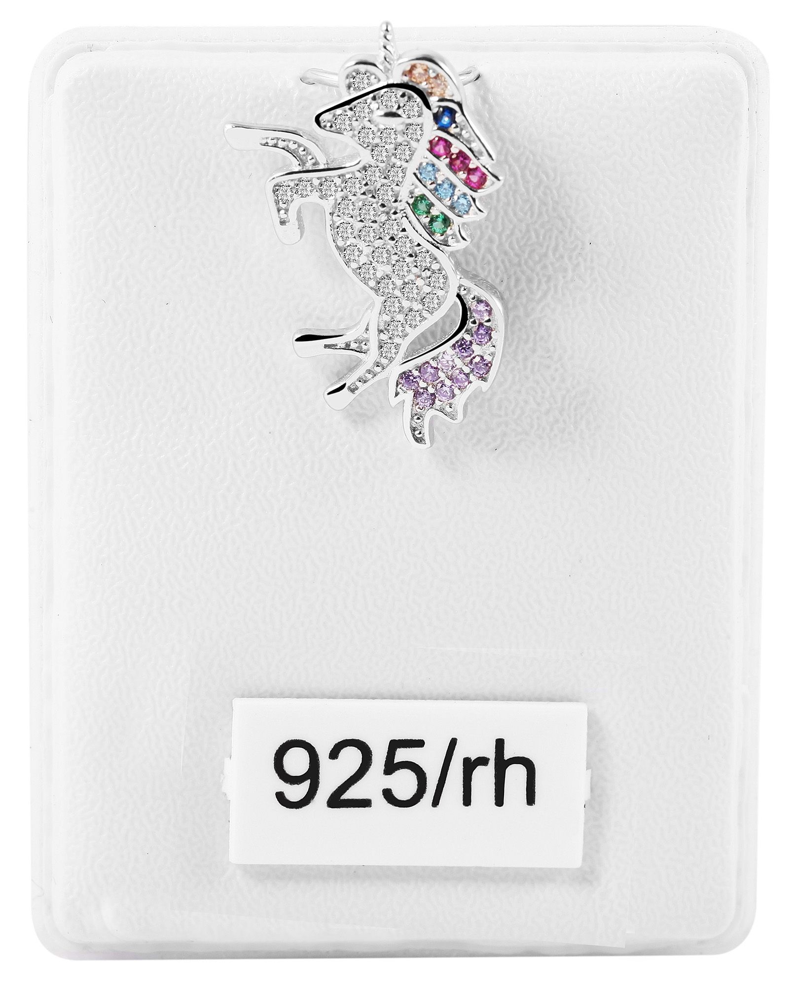 Dieser verspielte Einhorn-Anhänger wurde aus 925er Sterlingsilber hergestellt und ist mit einer hochwertigen Beschichtung aus Rhodium veredelt. Diese Schicht schützt das Material vor dem Anlaufen und sorgt zudem für einen lang anhaltenden Glanz. 56 Zirkoniasteine, die den Einhornanhänger dekorativ schmücken, davon 35 weiße und 21 bunte Steine, lassen die Einhornsilhoutte funkeln.
