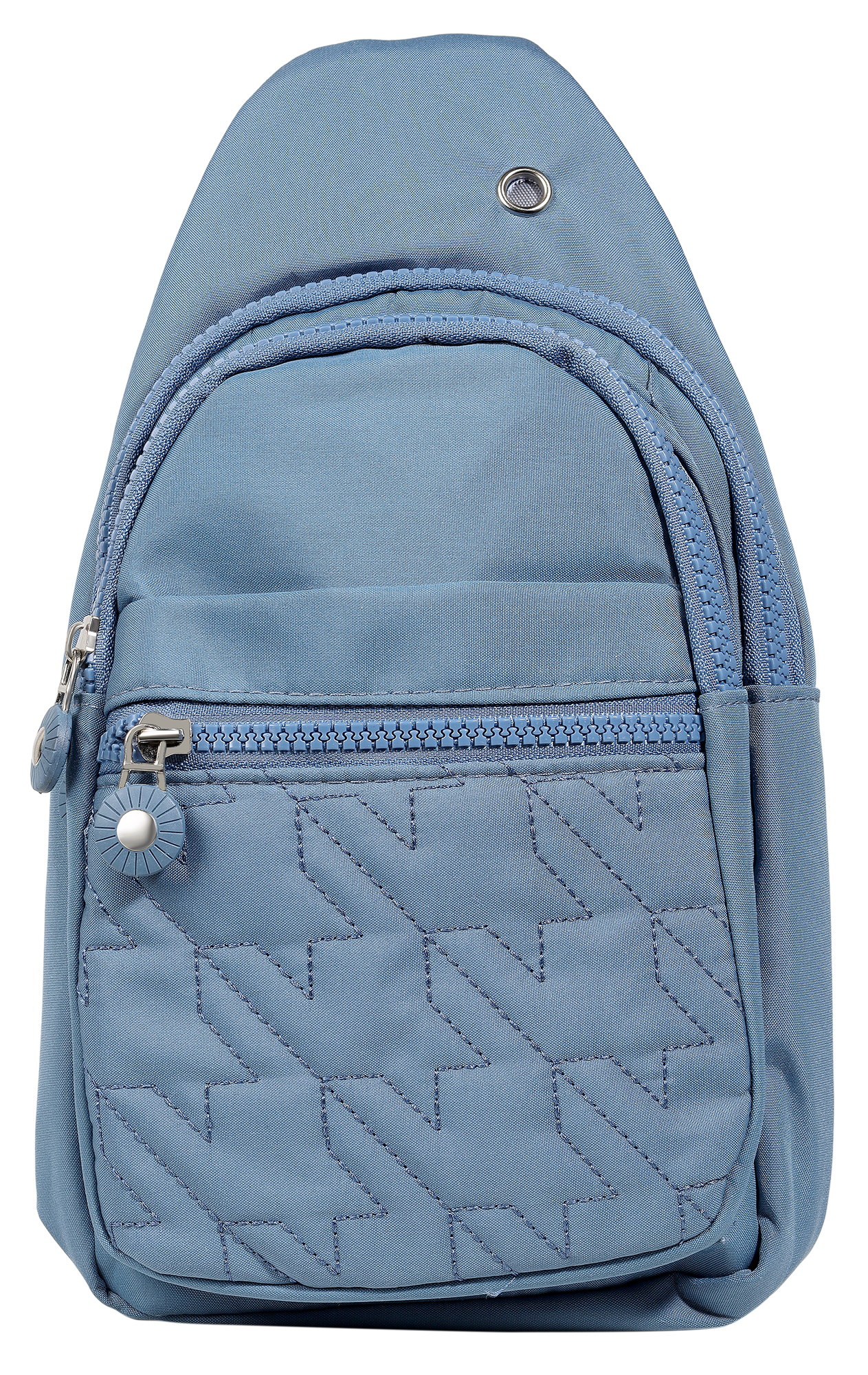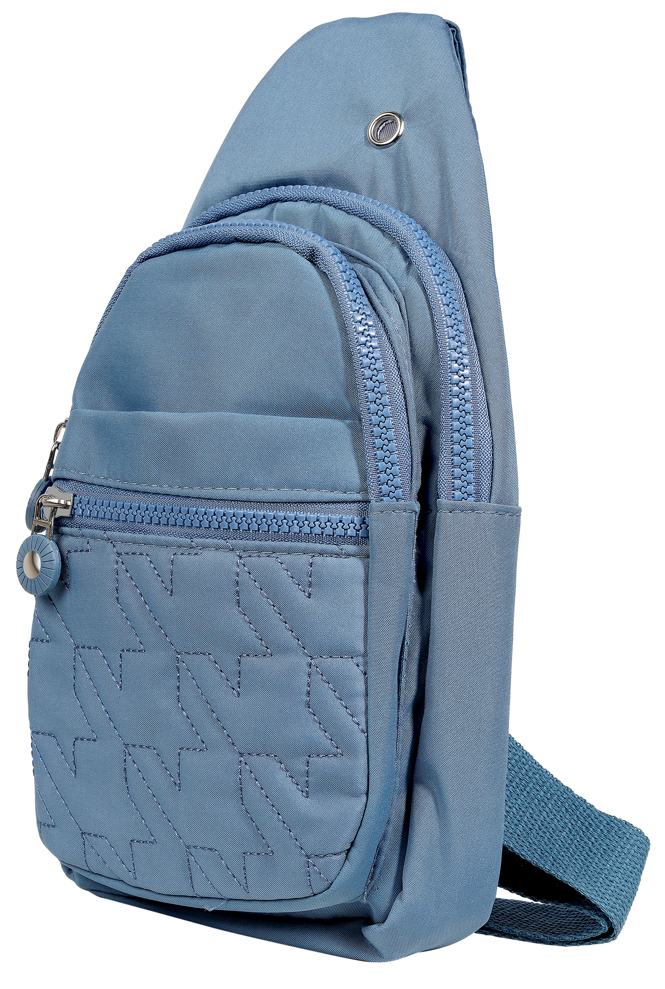 Design 2 – Textil-Brustttasche/ Cross-Body, 3 Front-Reißverschlussfächer, ein Reisverschlussfach im Hauptfach eine dekorative Steppnaht auf der vorderen Reisverschlusstasche, eine Metallöse rechts oben dient als zierendes Detail und zum Durchführen eines Ladekabels – ideal für unterwegs