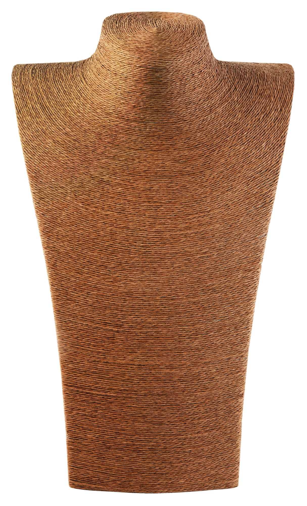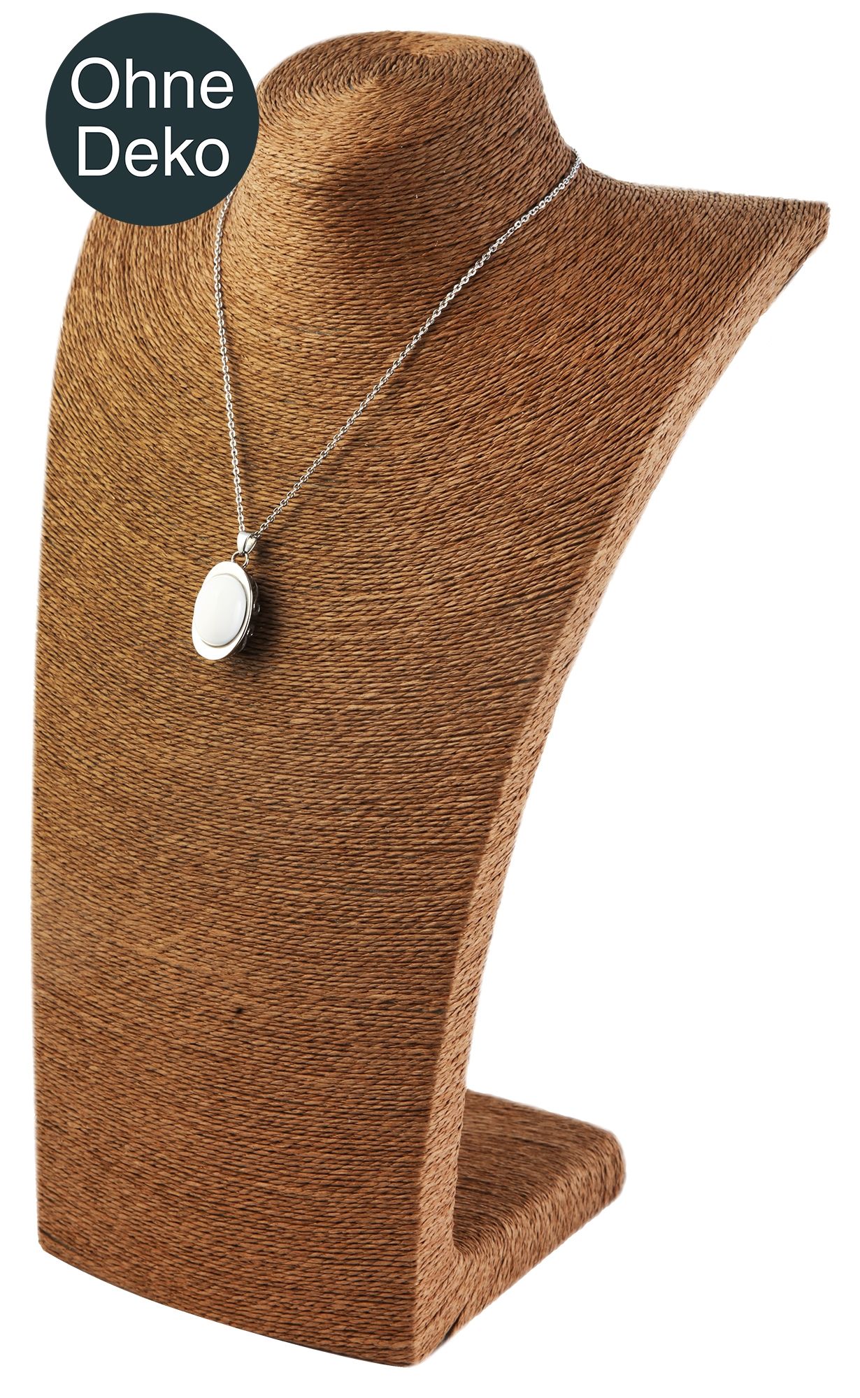 Der Schmuckhalter in schlichter Büstenform wurde aus Bastfaser hergestellt, diese Fasern sorgen für einen hochwertigen und dekorativen Look. Die Büste ist hellbraun und eignet sich hervorragend zur Präsentation von Schmuckstücken. Ob auf der Ladentheke, im Schaufenster oder Ausstellungsraum, die Büste macht überall eine gute Figur. Die Maße des Aufstellers ergeben sich aus einer Länge von 36 cm, einer Breite von 23 cm und einer Stärke von 7 cm.