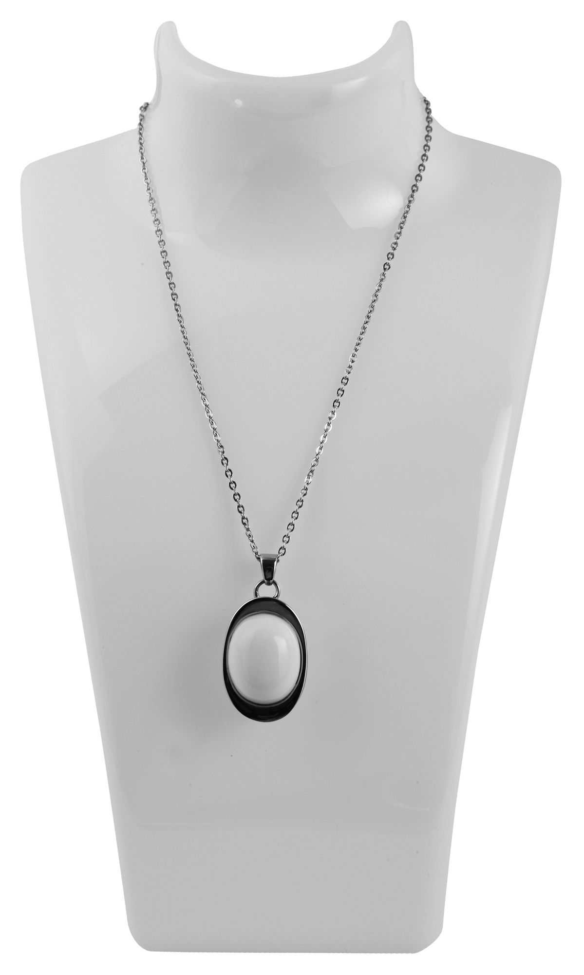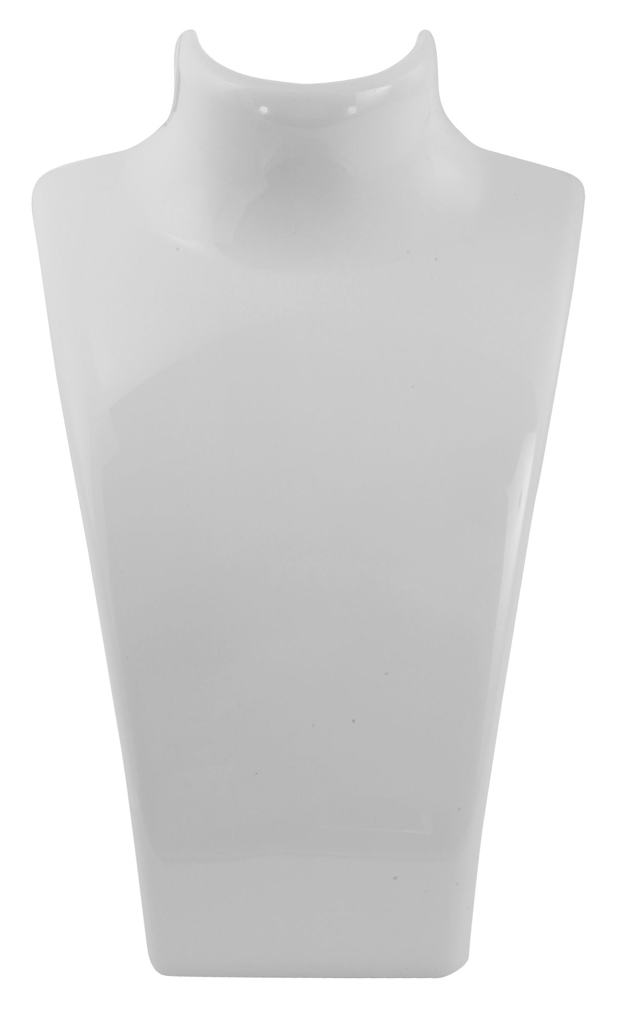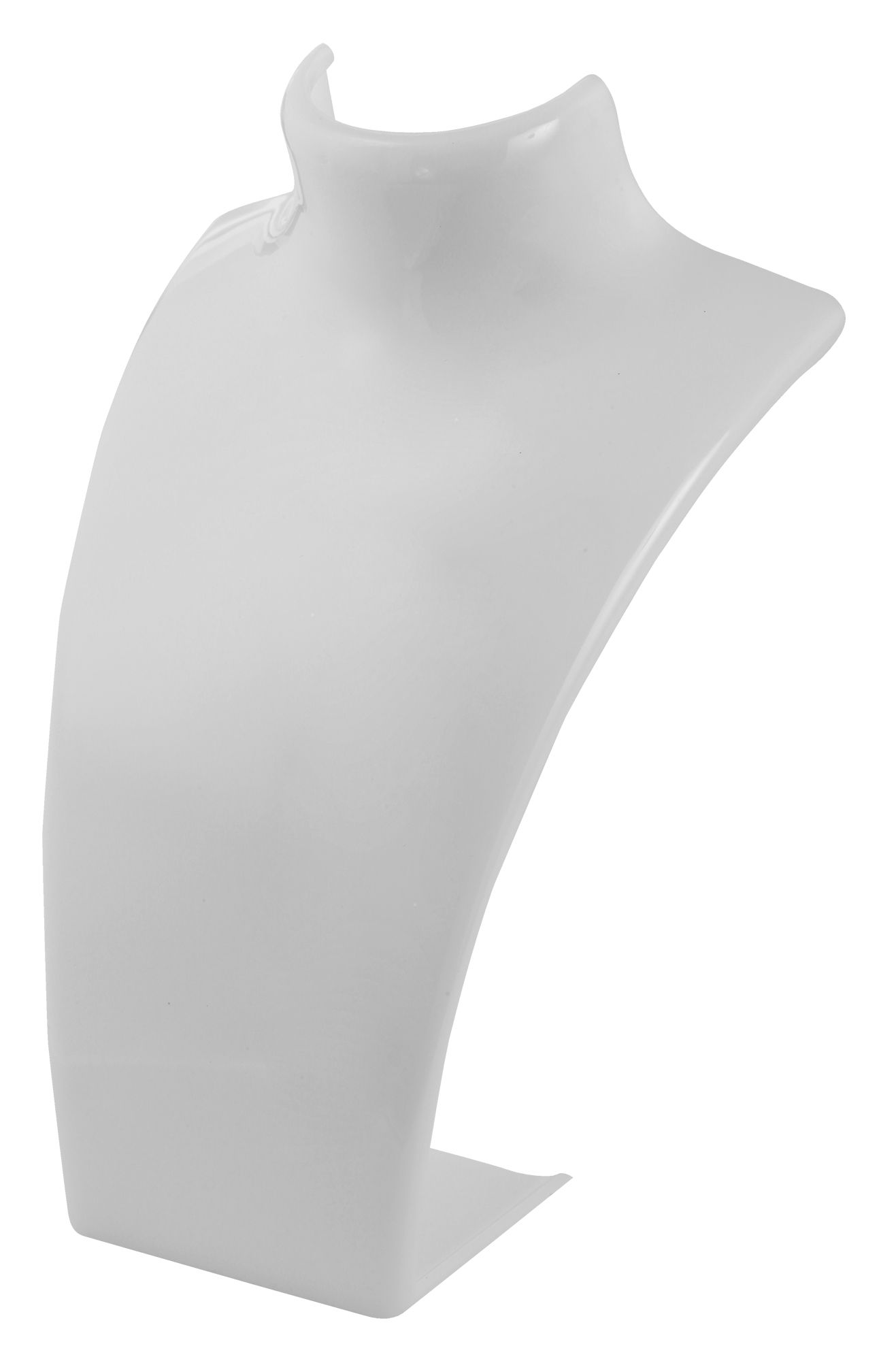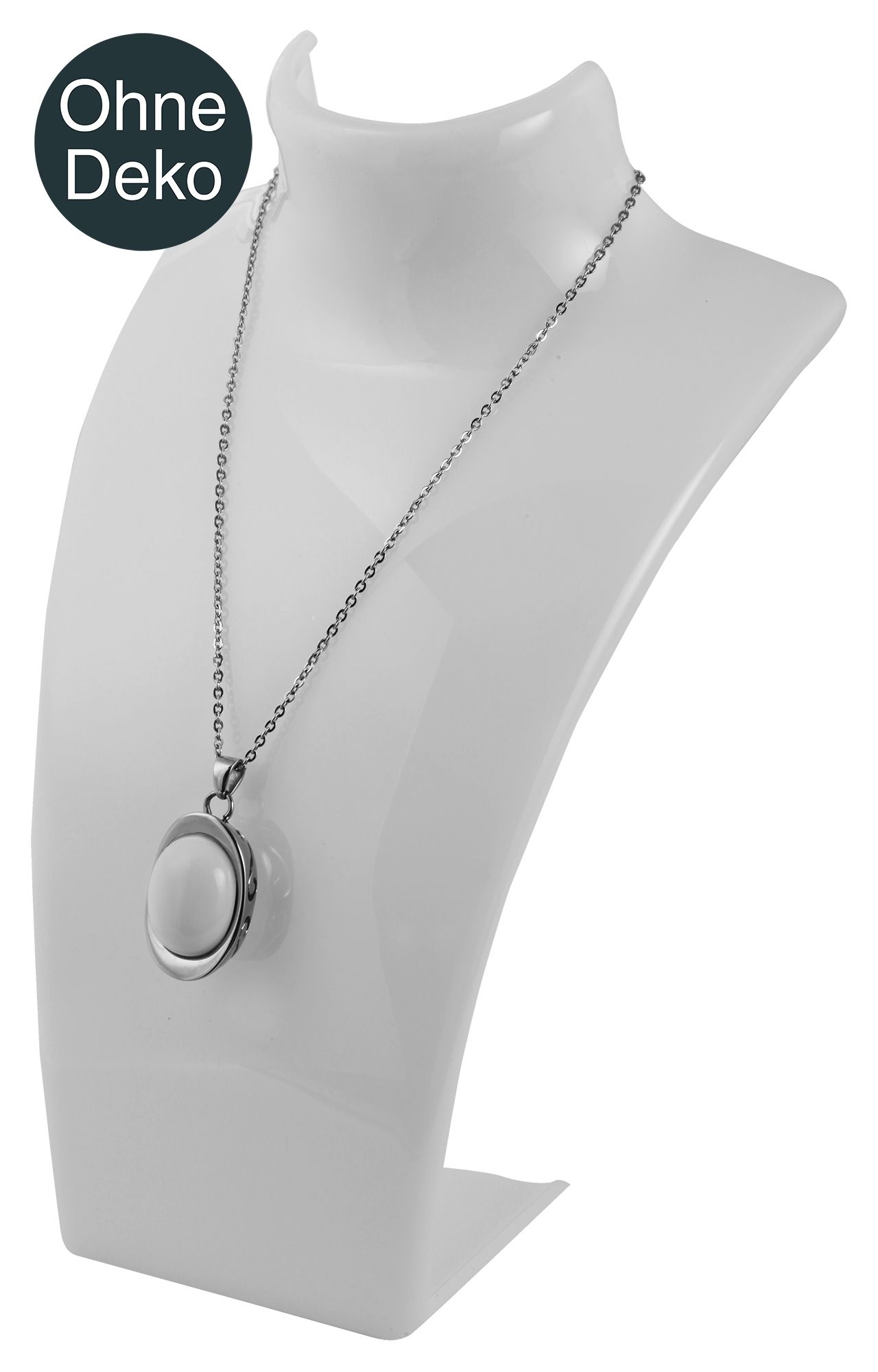 Die weiße Kunststoffbüste ist eine schlichte Büste, die zur Präsentation von Ketten und Colliers geeignet ist. Sie steht auf einem 6 cm langen fest verbundenen Fuß und ist im Gesamten leicht nach hinten gebogen. Die Schmuckstücke liegen im perfekten Winkel auf der Büste, sodass sie bestmöglich präsentiert werden können. Zusätzlich hat die Büste am 'Hals' zwei Löcher um das Anbringen von Befestigungsvarianten zu ermöglichen. Die Maße der Büste betragen 20,5 cm in der Höhe, 13,5 cm in der Breite und eine Länge von 12 cm. Die Büste ist in schwarz und in weiß erhältlich. Sie ist eine einfache Möglichkeit Ketten und Colliers bestmöglich zu präsentieren.