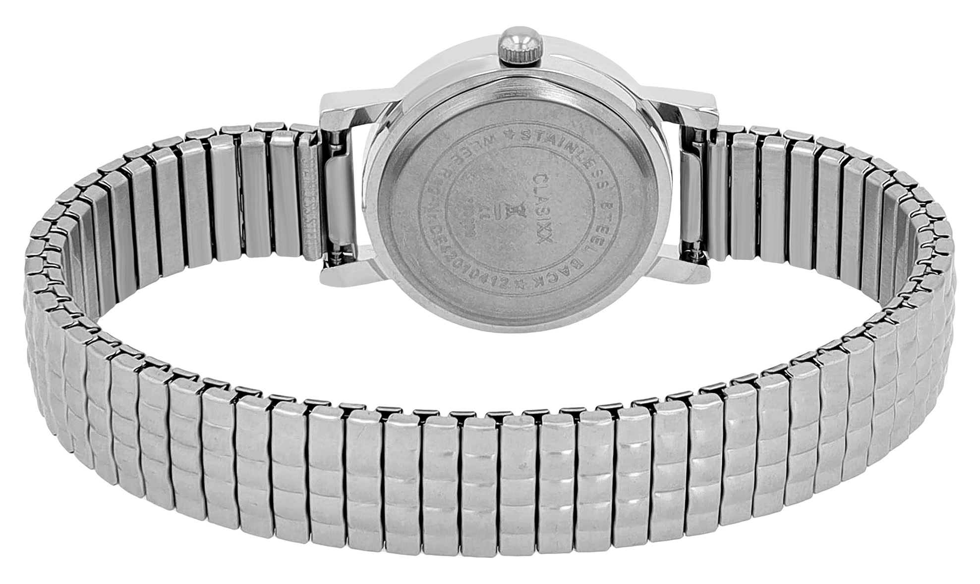 Die analoge 3-Zeiger Damenarmbanduhr der Marke Classixx verfügt über ein hochwertiges Quarzuhrwerk. Das flexible Zugarmband wurde aus Edelstahl gefertigt, lässt sich bequem und leichthändig über das Handgelenk ziehen und ist am Anstoß 12 mm breit. Die Gesamtlänge der Uhr beträgt 18 cm. Das Metallgehäuse mit Mineralglas hat einen Durchmesser von 22 mm und eine Gehäusehöhe von 7,5 mm. Der Gehäuseboden wurde aus Edelstahl hergestellt. Das übersichtliche Zifferblatt mit arabischen Ziffern sorgt für eine klare Anzeige, sodass man die Uhrzeit schnell im Blick hat. Rundum ist dieser Zeitmesser ein zuverlässiger Begleiter, der sich zu allen Anlässen und Gelegenheiten tragen lässt.