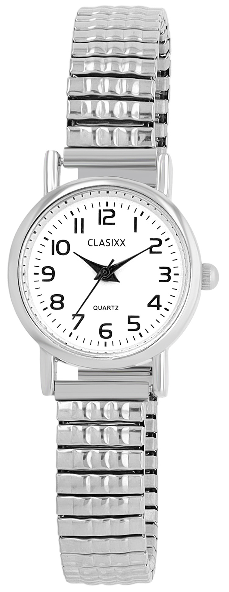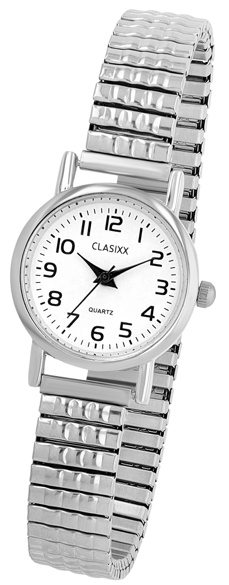 Die analoge 3-Zeiger Damenarmbanduhr der Marke Classixx verfügt über ein hochwertiges Quarzuhrwerk. Das flexible Zugarmband wurde aus Edelstahl gefertigt, lässt sich bequem und leichthändig über das Handgelenk ziehen und ist am Anstoß 12 mm breit. Die Gesamtlänge der Uhr beträgt 18 cm. Das Metallgehäuse mit Mineralglas hat einen Durchmesser von 22 mm und eine Gehäusehöhe von 7,5 mm. Der Gehäuseboden wurde aus Edelstahl hergestellt. Das übersichtliche Zifferblatt mit arabischen Ziffern sorgt für eine klare Anzeige, sodass man die Uhrzeit schnell im Blick hat. Rundum ist dieser Zeitmesser ein zuverlässiger Begleiter, der sich zu allen Anlässen und Gelegenheiten tragen lässt.