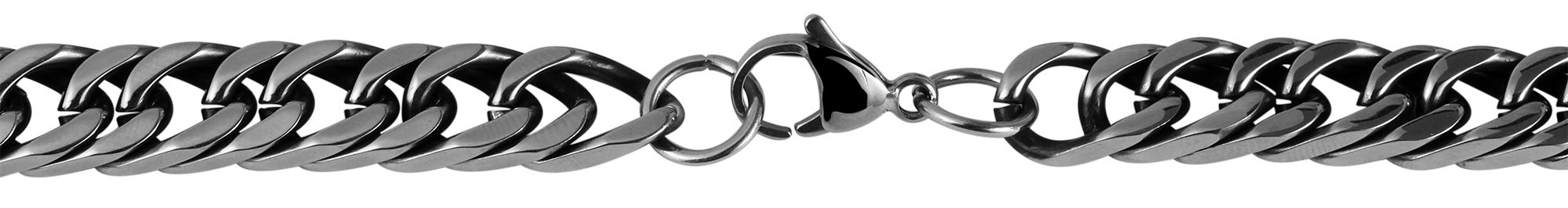 Die Panzer-Halskette der Marke Akzent wurde aus rostfreiem Edelstahl gefertigt. Das Material garantiert eine lange Lebensdauer der Halskette. Die Kette wird in silberfarbig und Anthrazit gehalten. Veredelt wird das Akzent Schmuckstück mit einer gediegenen IP Black-Beschichtung. Mit einem Edelstahl Karabinerverschluss wird die Kette hinten am Hals gesichert. Die Länge der Kette beträgt 60 cm. Die Kettenstärke beträgt 9 mm.