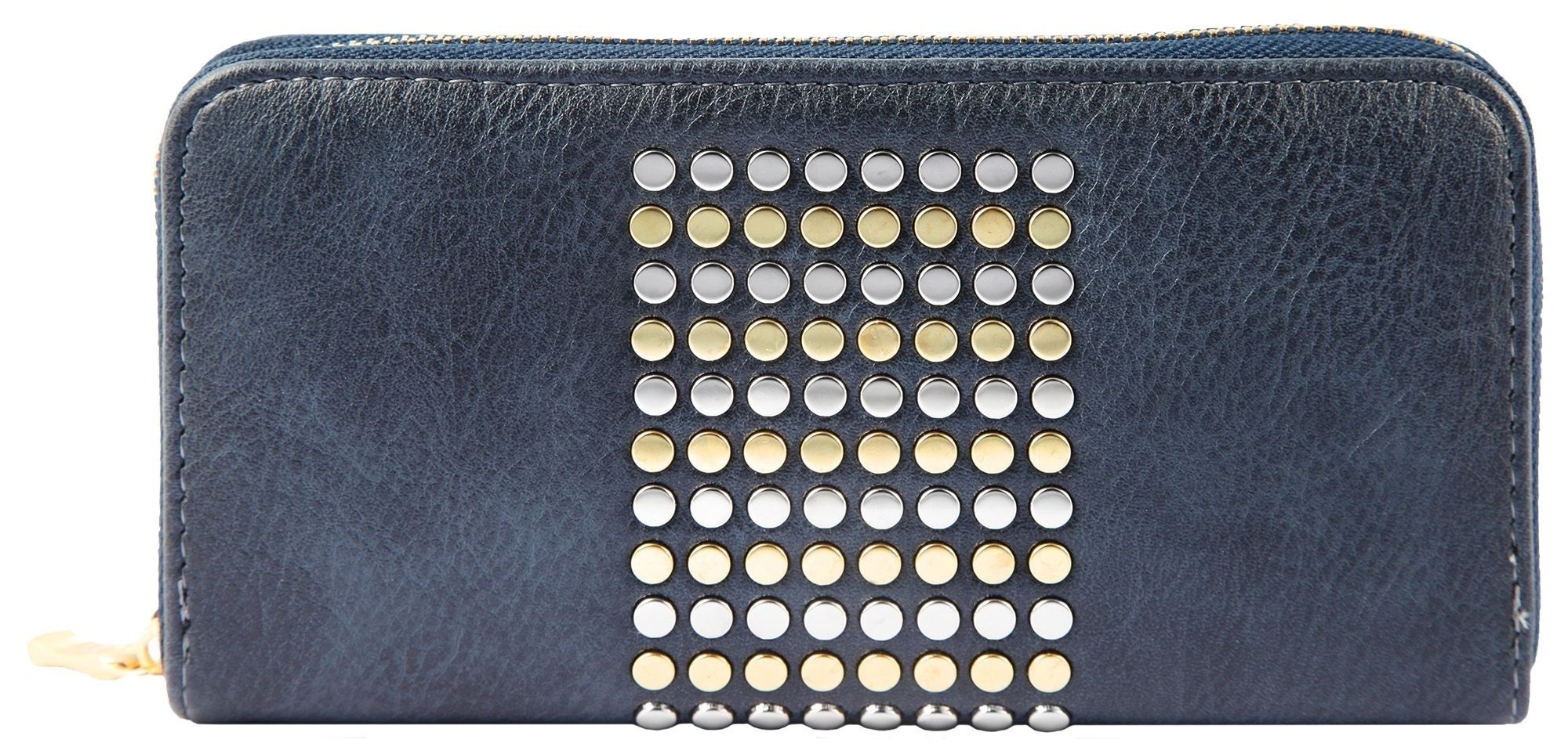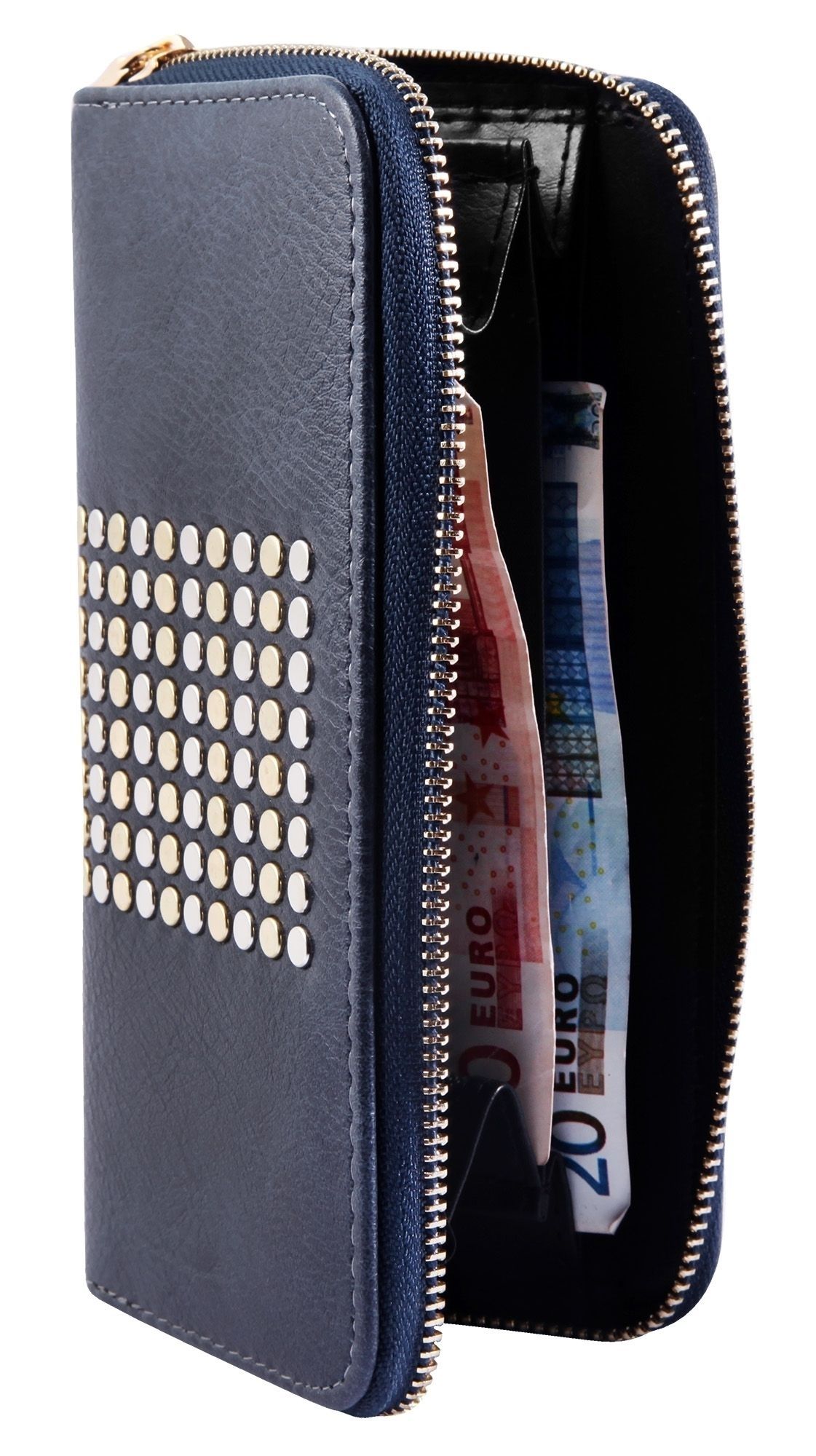 Die blaue Damengeldbörse der Marke Cham Cham wurde im Hochformat aus Lederimitat hergestellt. Sie hat eine glatte Oberfläche und wird mittig mit mehreren runden Metallelementen verziert. Die Geldbörse ist nicht nur optisch ein Hingucker, sondern auch ein wahres Platzwunder und bietet viel Stauraum für alle wichtigen Dokumente. Sie ist aufgeteilt in 8 Kreditkartenfächer, 2 Einsteckfächer, 3 Geldscheinfächer und 1 Münzgeldfach mit Reißverschluss. Die Größe der Börse ergibt sich aus einer Breite von 19 cm, einer Länge von 10 cm und einer Höhe von 2 cm.
