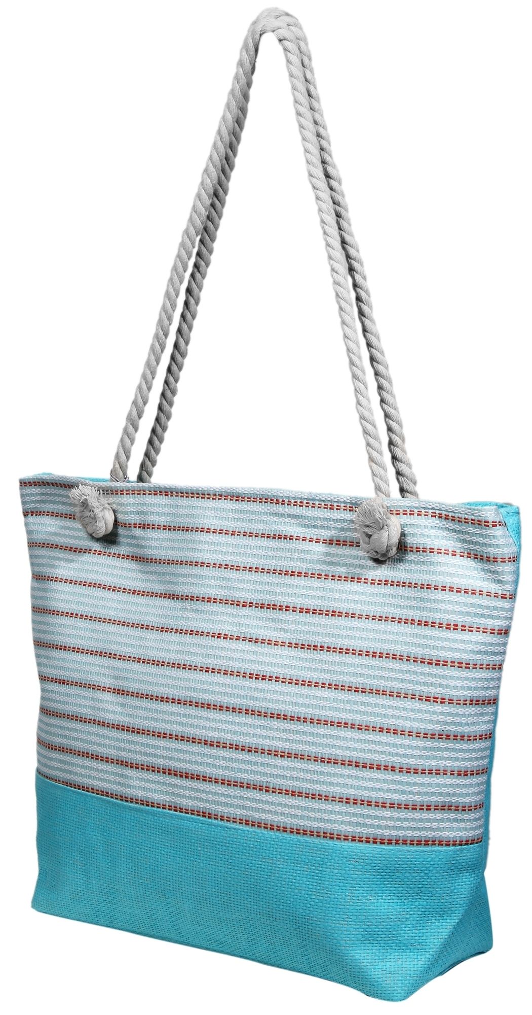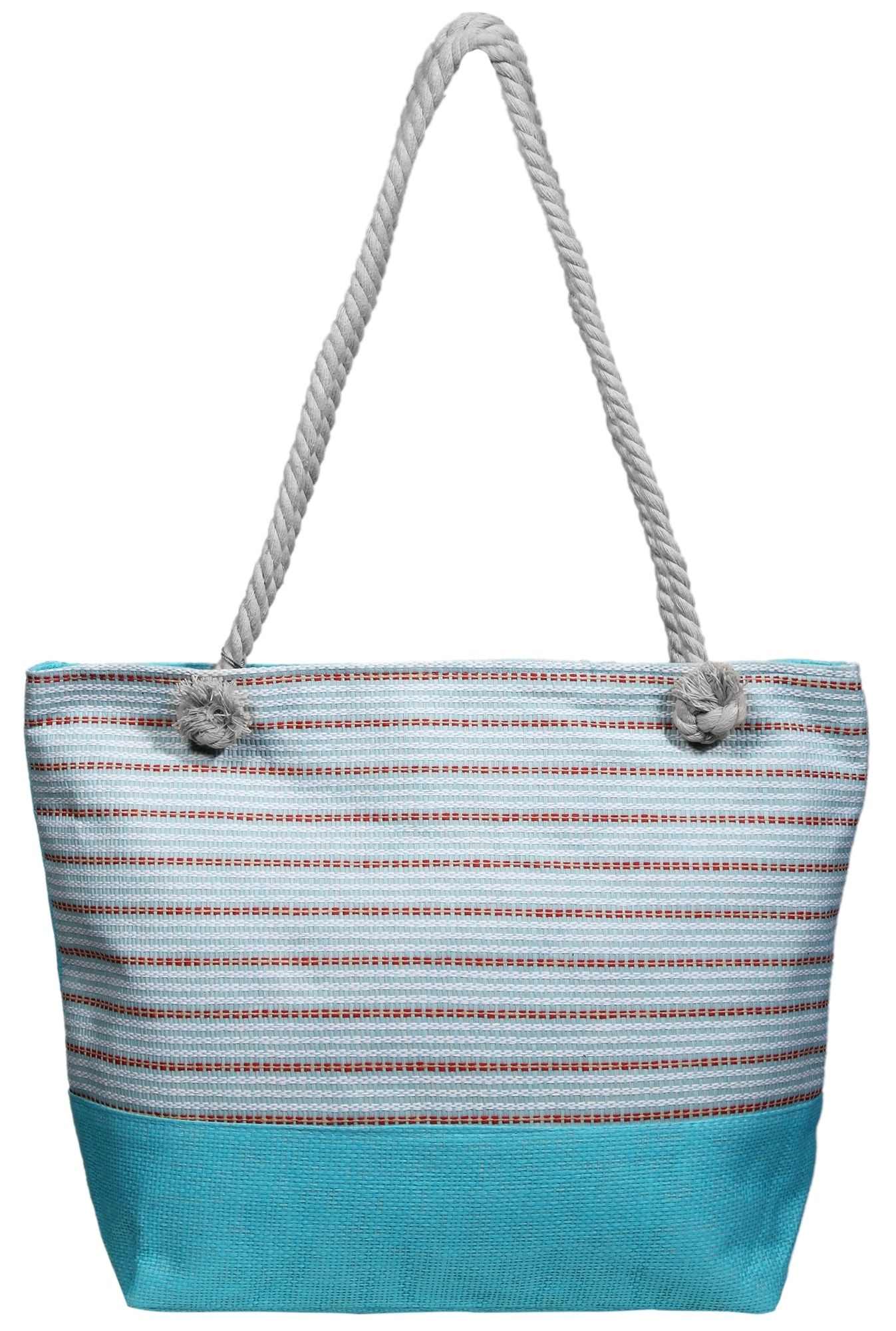 Die farbenfrohe Handtasche mit Kordelhenkeln wurde aus Textil hergestellt und ist mit blauen/ türkisen Streifen geschmückt. Die Sommertasche bietet geräumigen Stauraum, hat ein großes Innenfach mit Reißverschluss und ein Handyfach im Innenraum. Durch das Material und des Designs kann diese Handtasche auch sehr gut als Strandtasche getragen werden. Die Maße der Tasche ergeben sich aus einer Länge von 14 cm, einer Breite von 51 cm und einer Höhe von 37 cm.