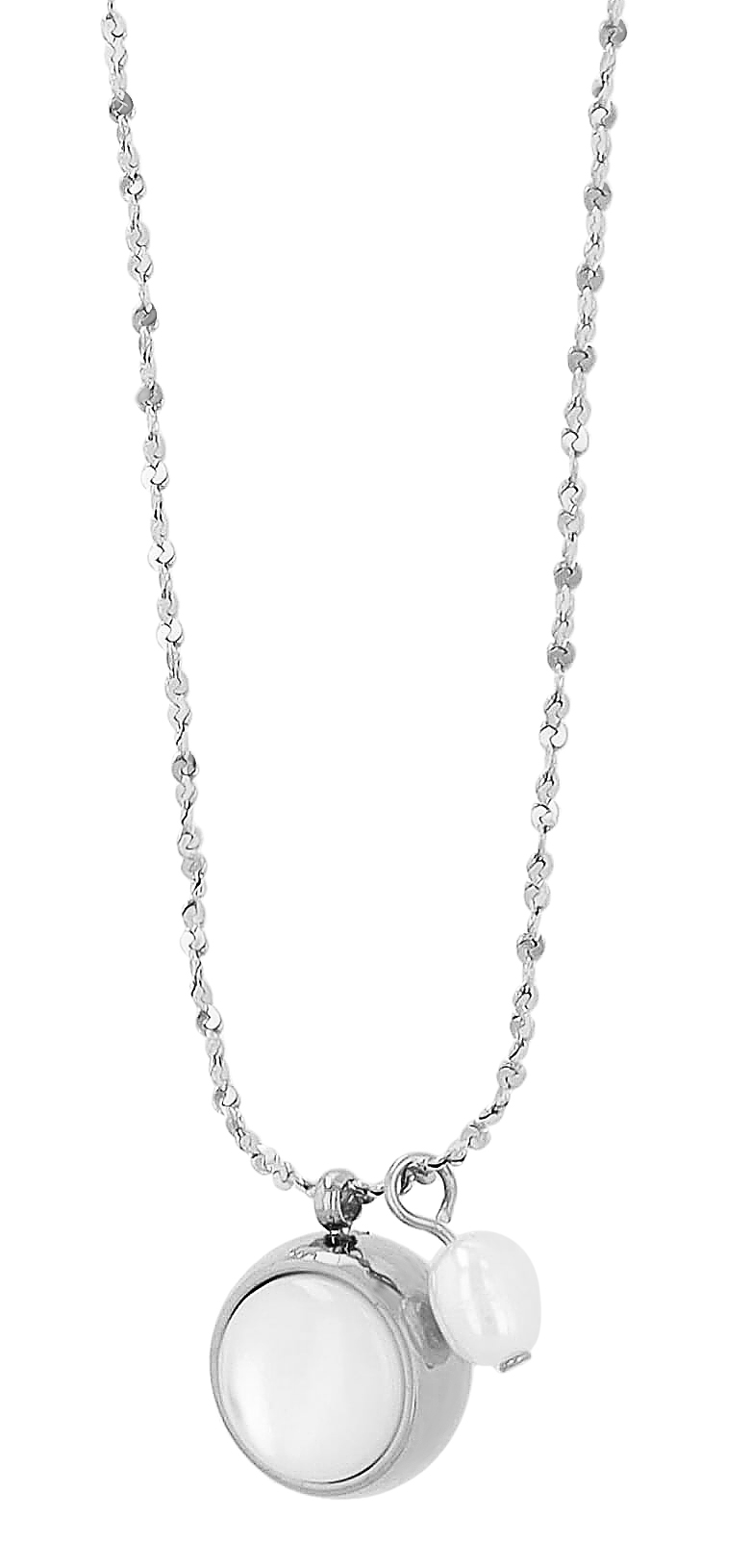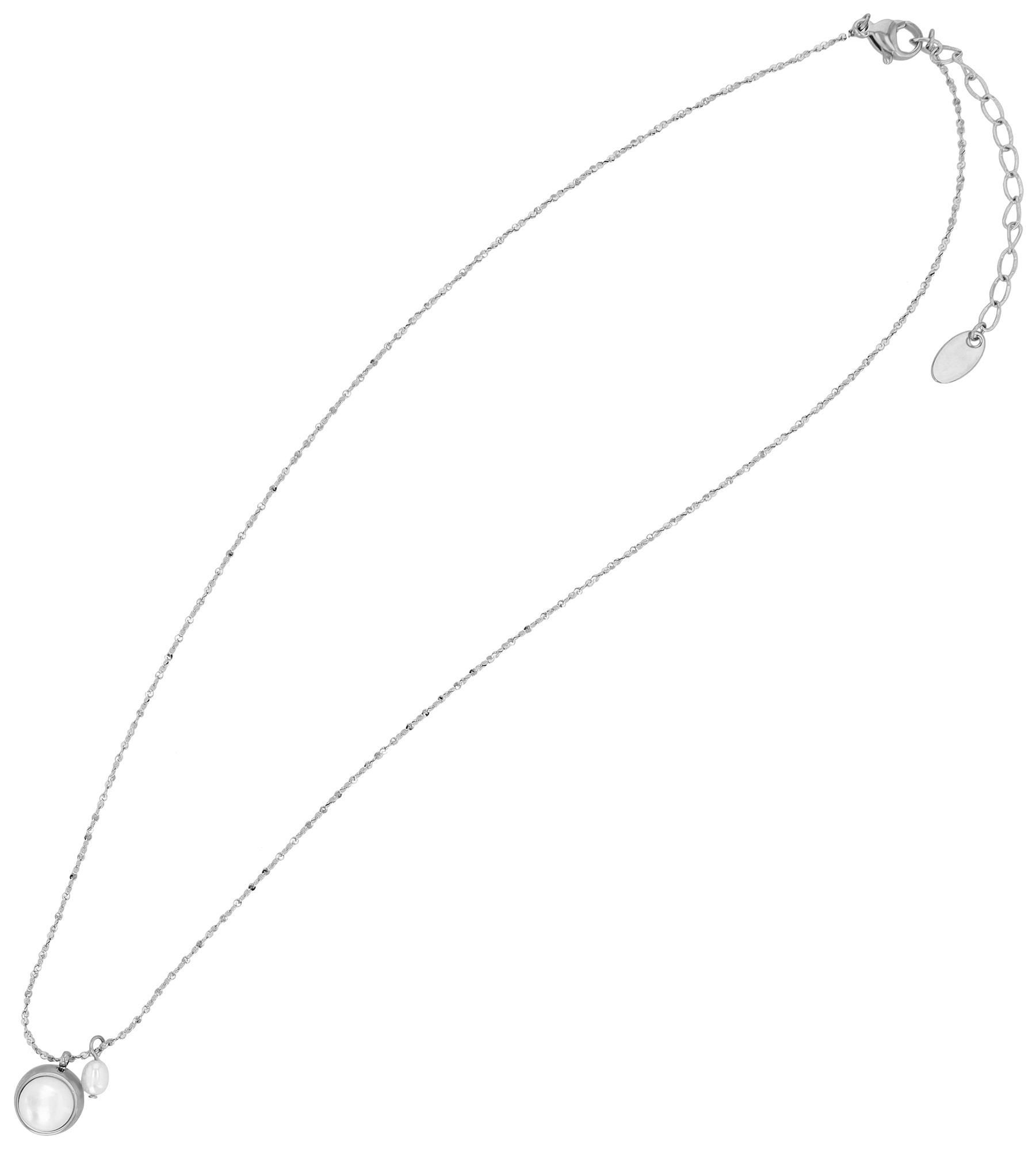 Gefertigt aus hochwertigem Edelstahl verkörpert unsere Halskette mit zwei Anhängern nicht nur zeitlose Eleganz, sondern auch Langlebigkeit und Beständigkeit. Edelstahl ist resistent gegen Korrosion und Anlaufen, was sicherstellt, dass die Kette auch nach längerem Tragen ihre strahlende Schönheit bewahrt. Die Halskette erstreckt sich über eine Länge von 41 cm, mit einer zusätzlichen 5 cm Verlängerungskette für eine individuelle Anpassung. Der sichere Karabinerverschluss sorgt nicht nur für einen festen Halt, sondern auch für eine einfache Handhabung. Das Herzstück dieser bezaubernden Halskette ist der Anhänger mit Perlmuttoptik (Ø 10 mm), mit zusätzlich einem Ornament auf der Rückseite und ein zweiter kleiner Anhänger mit einer zierlichen Süßwasserperle (8,5 x 4 mm). Die weißen Anhänger strahlen eine natürliche Schönheit aus und verleiht der Halskette eine sanfte Eleganz.