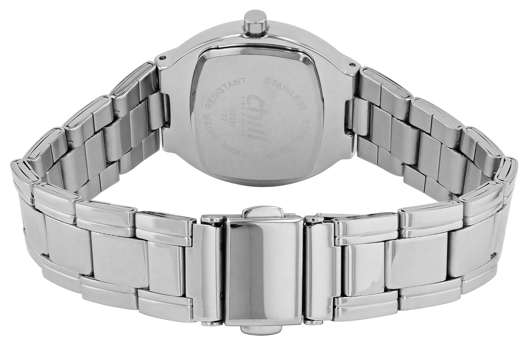 Die Uhr wird von einem hochwertigen Edelstahlband gehalten, das konisch zulaufend ist. Die Breite des Bandes beträgt 16 mm am Anstoß. Dieses Design sorgt für einen fließenden Übergang zum Gehäuse und hohen Tragekomfort. Der Verschluss ist eine zuverlässige Faltschließe.