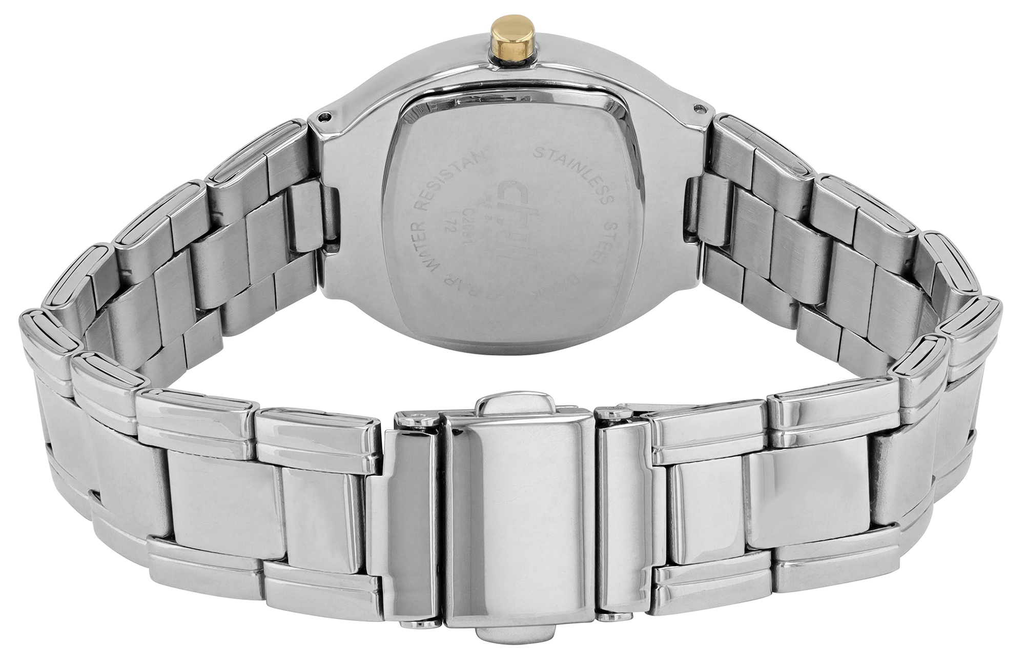 Die Uhr wird von einem hochwertigen Edelstahlband gehalten, das konisch zulaufend ist. Die Breite des Bandes beträgt 16 mm am Anstoß. Dieses Design sorgt für einen fließenden Übergang zum Gehäuse und hohen Tragekomfort. Der Verschluss ist eine zuverlässige Faltschließe.