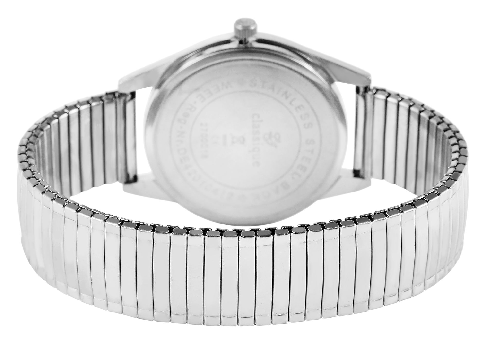 Die analoge 3-Zeiger Herrenarmbanduhr der Marke Classique verfügt über ein hochwertiges Quarzuhrwerk. Das silberfarbene Edelstahlzugarmband ist am Anstoß 16 mm breit und lässt sich aufgrund des flexiblen Armbandes besonders bequem und einfach über das Handgelenk ziehen. Die Gesamtlänge der Uhr beträgt 20 cm. Das silberfarbige Metallgehäuse mit Mineralglas hat eine Abmessung von 36 mm im Durchmesser und einer Gehäusehöhe von 9 mm. Der Gehäuseboden ist aus Edelstahl gefertigt. Dank des schlicht schwarzen Zifferblattes und der übersichtlichen Einteilung lässt sich die Uhrzeit schnell auf einen Blick ablesen. Die Zeiger sind silberfarben und die Indexe weiß. Zudem verfügt die Armbanduhr über eine Datumsanzeige auf drei Uhr. Dieses zeitlose Uhrenmodell ist ein wahrer Klassiker und gerade deswegen ideal als Geschenk für die Liebsten geeignet.