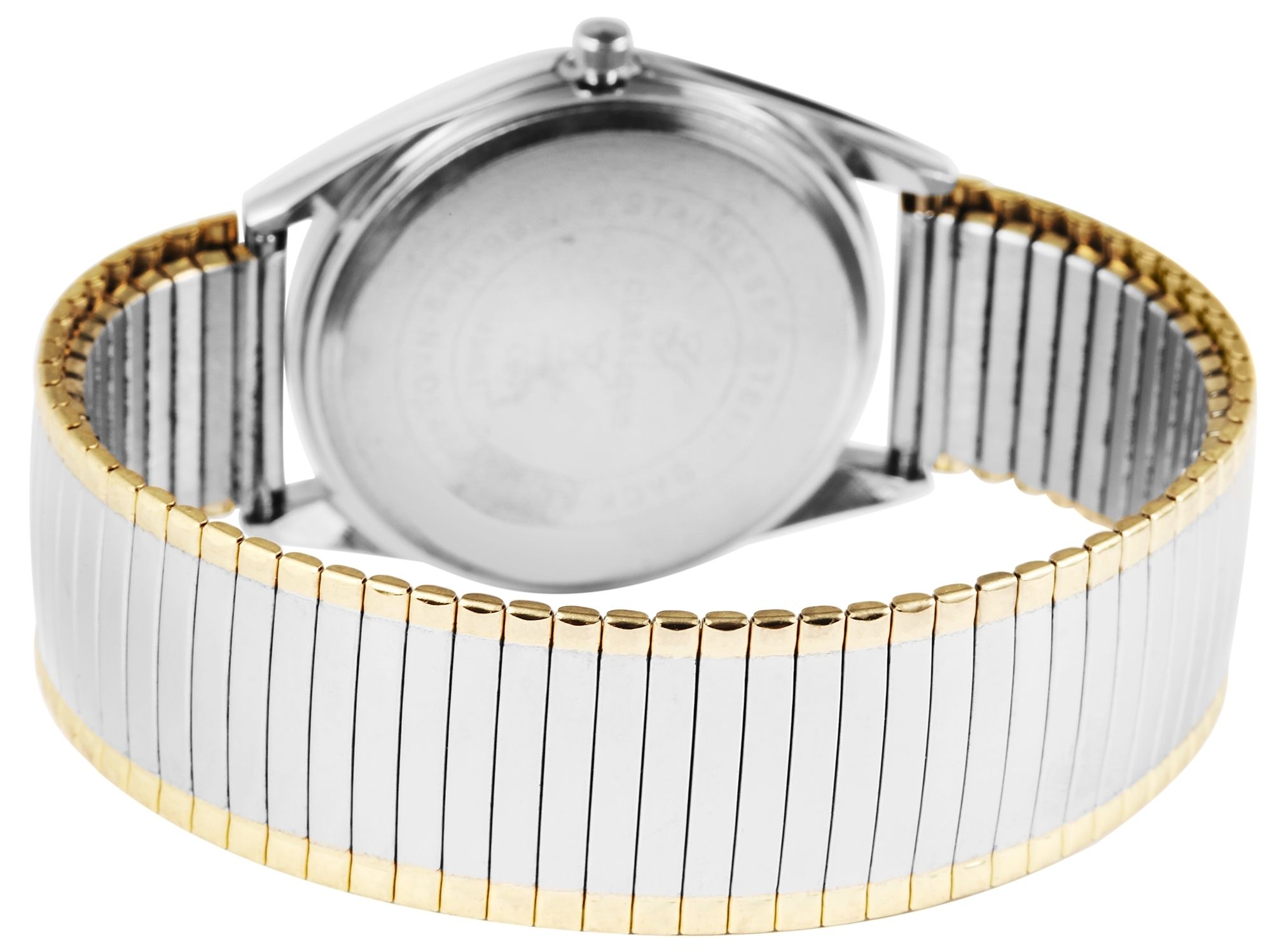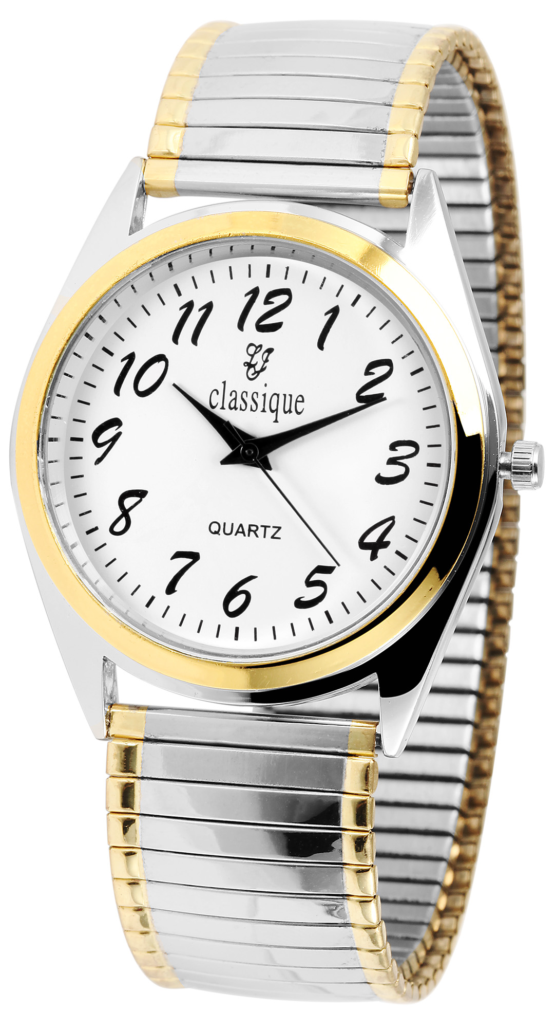 Die analoge 3-Zeiger Herrenarmbanduhr der Marke Classique verfügt über ein hochwertiges Quarzuhrwerk. Das silber-goldfarbene Edelstahlzugarmband ist am Anstoß 18 mm breit und lässt sich aufgrund des flexiblen Armbandes besonders bequem und einfach über das Handgelenk ziehen. Die Gesamtlänge der Uhr beträgt 20 cm. Das Metallgehäuse in bicolor mit Mineralglas hat eine Abmessung von 35 mm im Durchmesser und einer Gehäusehöhe von 7 mm. Der Gehäuseboden ist aus Edelstahl gefertigt. Dank des schlicht weißen Zifferblattes und der übersichtlichen Einteilung lässt sich die Uhrzeit schnell auf einen Blick ablesen. Die Zeiger und Indexe sind schwarz und setzen sich farblich ab. Dieses zeitlose Uhrenmodell ist ein wahrer Klassiker und gerade deswegen ideal als Geschenk für die Liebsten geeignet.