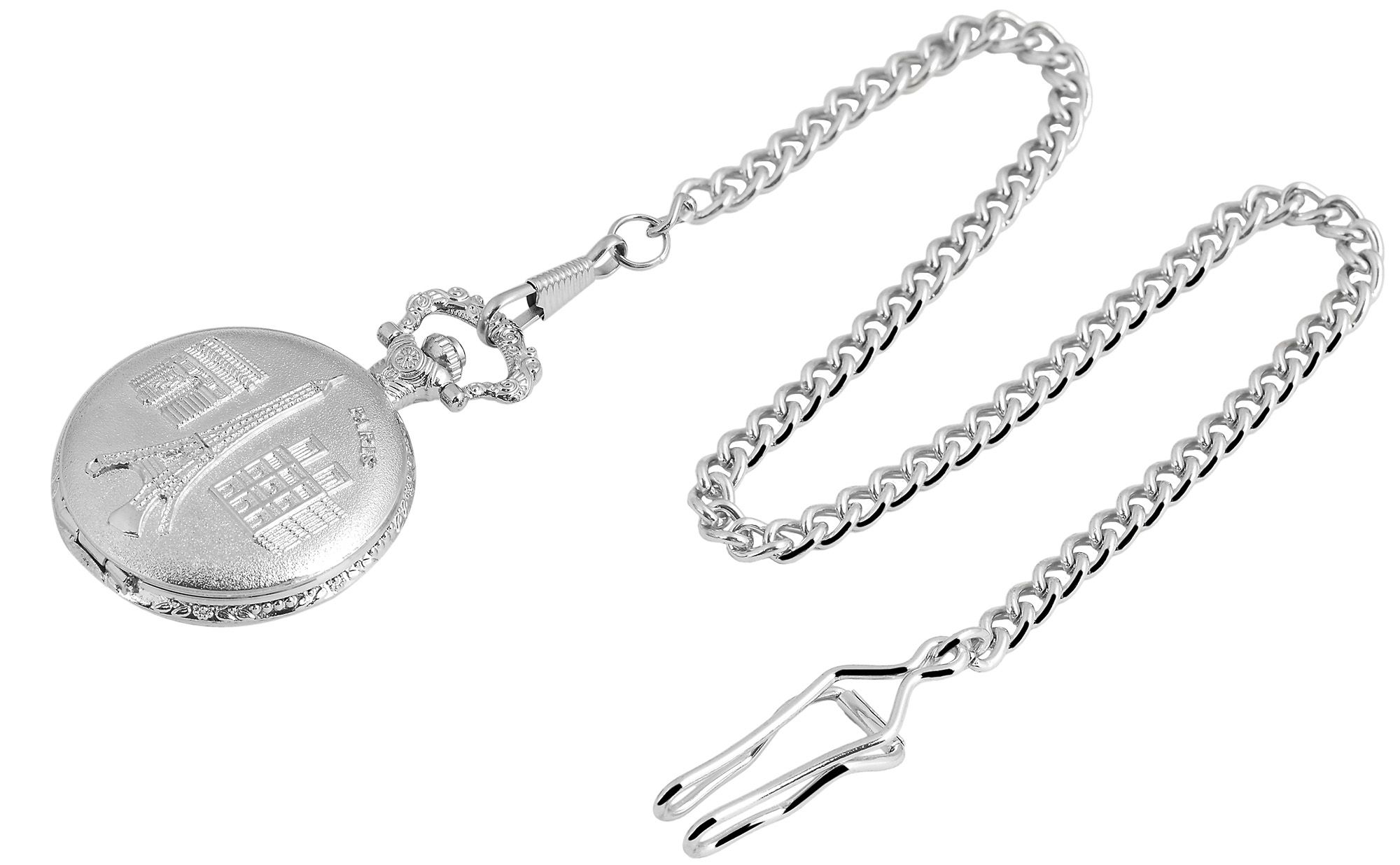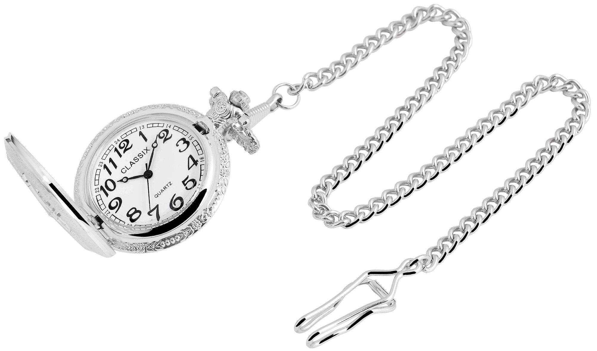 Die Analog Taschenuhr der Marke Classix verfügt über ein Hochwertiges Quarzwerk. Das Metallgehäuse mit Mineralglas hat eine Abmessung von 46 mm und 15 mm Gehäusehöhe. Der Gehäusedeckel ist aus Metall gefertigt.