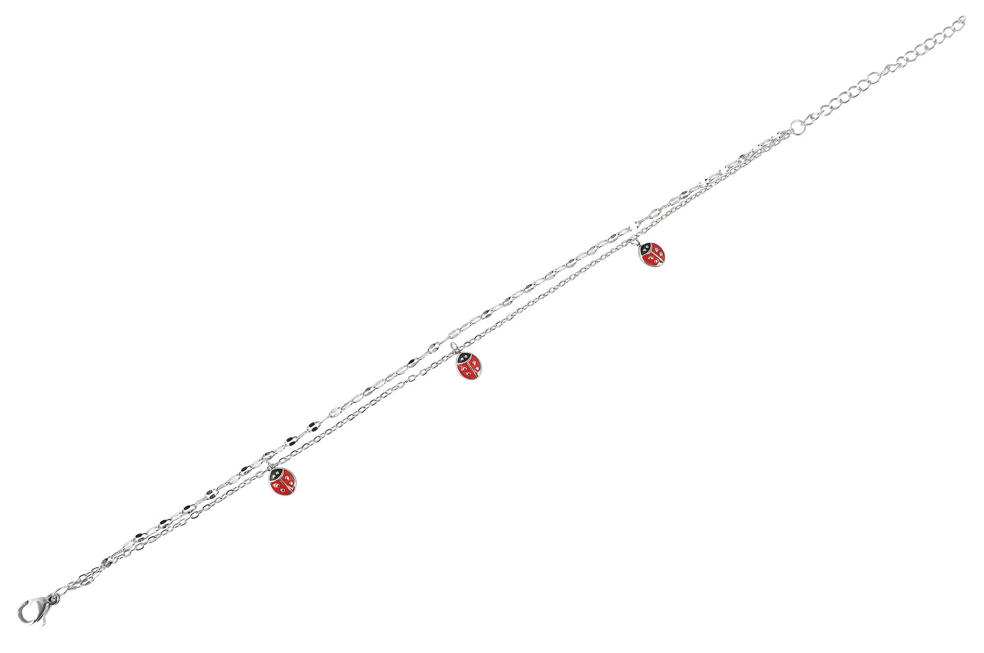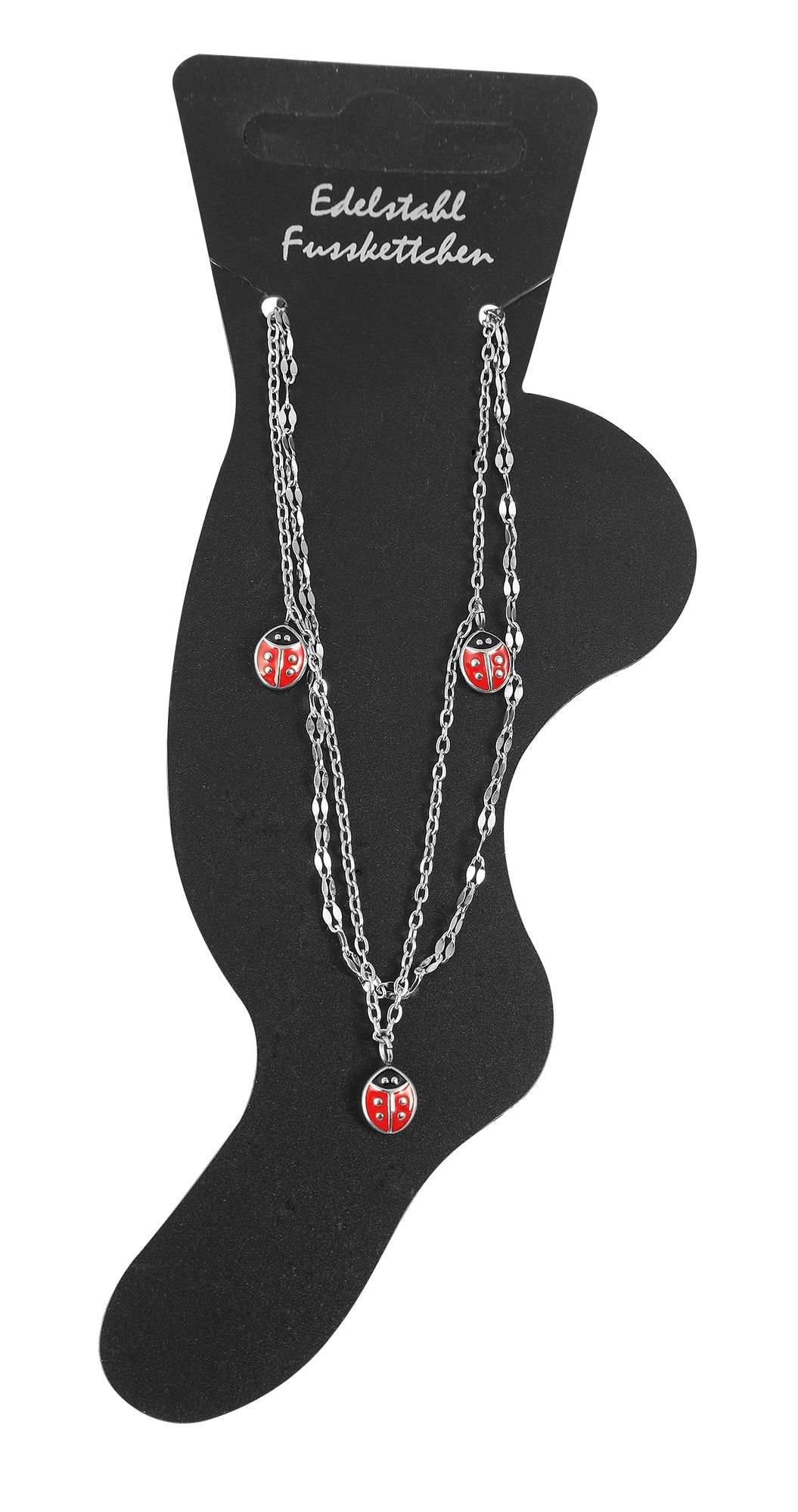 Das "Coccinella" Fusskettchen präsentiert sich im angesagten 2-Layering-Look mit einer Ankerkette in zwei Varianten. Die Anhänger, drei bezaubernden Marienkäfern verleihen dem Fusskettchen einen fröhlichen Charme, der das Kind in dir zum Strahlen bringt.