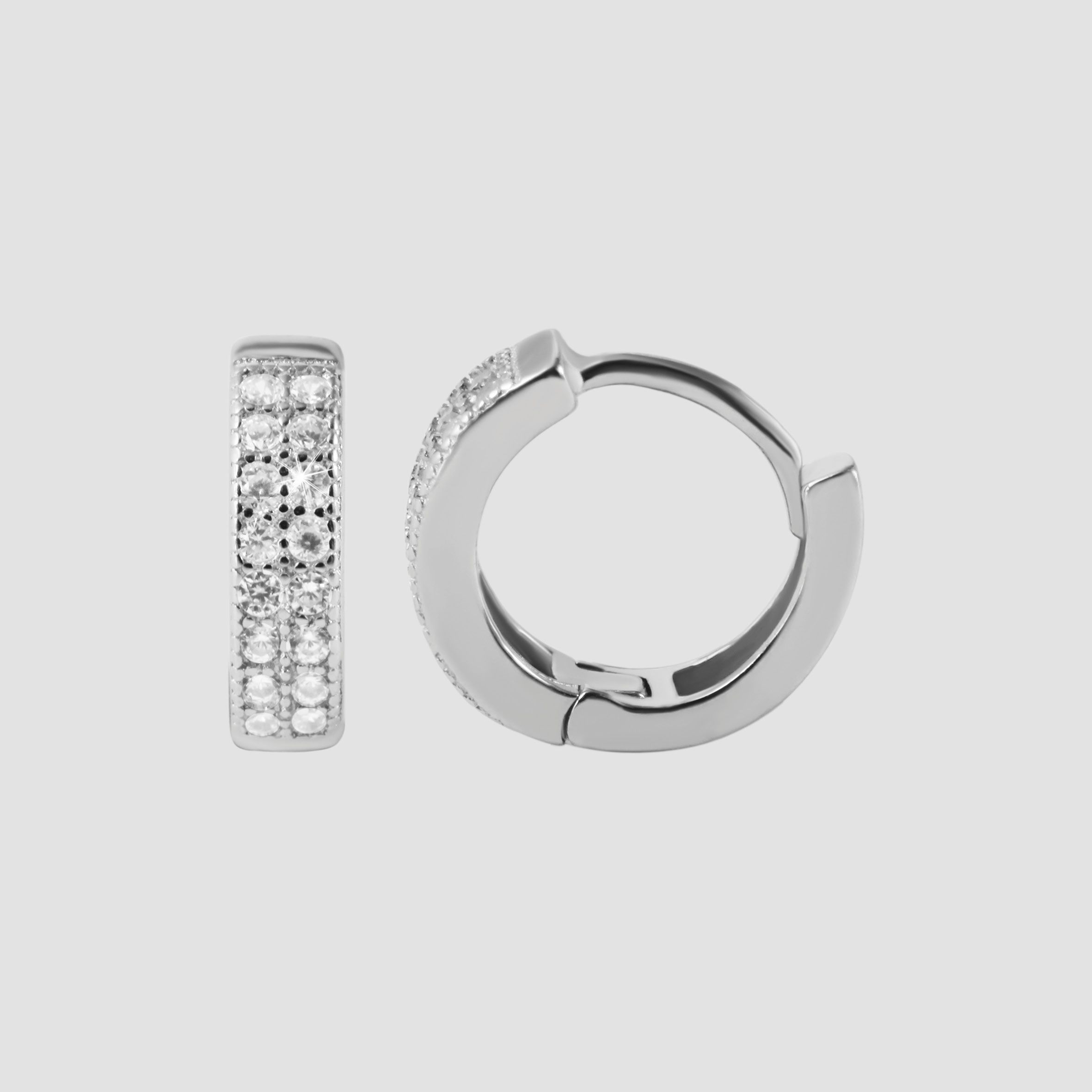 Die Klappcreolen wurden aus 925er Sterlingsilber hergestellt und zusätzlich mit einer hochwertigen Beschichtung aus Rhodium veredelt. Diese Schicht verhindert ein Anlaufen des Materials und sorgt zudem für lang anhaltenden Glanz. Auf der Vorderseite der polierten Creolen zeigen sich 16 funkelnde Zirkoniasteine, die den schlichten Ohrringen einen femininen Touch verpassen. Verschlossen werden sie mit einem praktischen Klappverschluss, der ein leichthändiges An-und Ablegen garantiert. Die Größe ergibt sich aus einem Durchmesser von 8 mm, einer Breite von 3 mm und einer Stärke von 2 mm. Dieses Produkt wird auf einem weißen Schmuckkärtchen geliefert. Es hat eine Maße von 38 x 55 mm und eignet sich ideal zum Präsentieren in dem dazu geeigneten Display oder zum Verpacken als Geschenk.