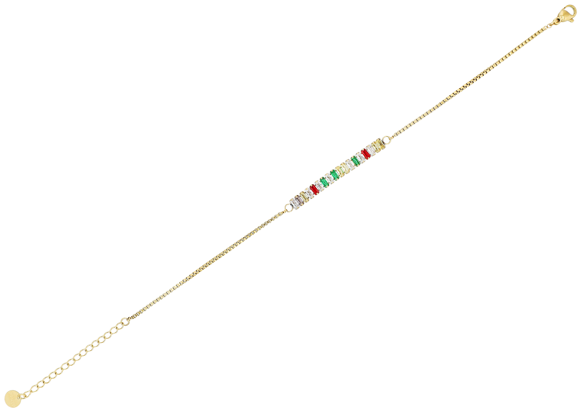 Die Fußkette der Marke Akzent wurde aus Edelstahl im Venezianermuster hergestellt und mittig mit achtzehn bunten Zirkoniasteinen verziert. Öffnen und schließen lässt sich die Fußkette mit einem Karabinerhaken, der ebenfalls aus Edelstahl gefertigt ist. Durch eine 5 cm lange Verlängerungskette, die an das eine Ende des Kettchens angebracht ist, lässt sich die Länge variieren, sodass die Fußkette an jedes Fußgelenk angepasst werden kann. Die Maße ergeben sich aus einer Länge von 21 cm und einer Kettenstärke von 2 mm. Das Zirkonia-Element ist 5 mm breit, 50 mm lang und hat eine Materialstärke von 3 mm.