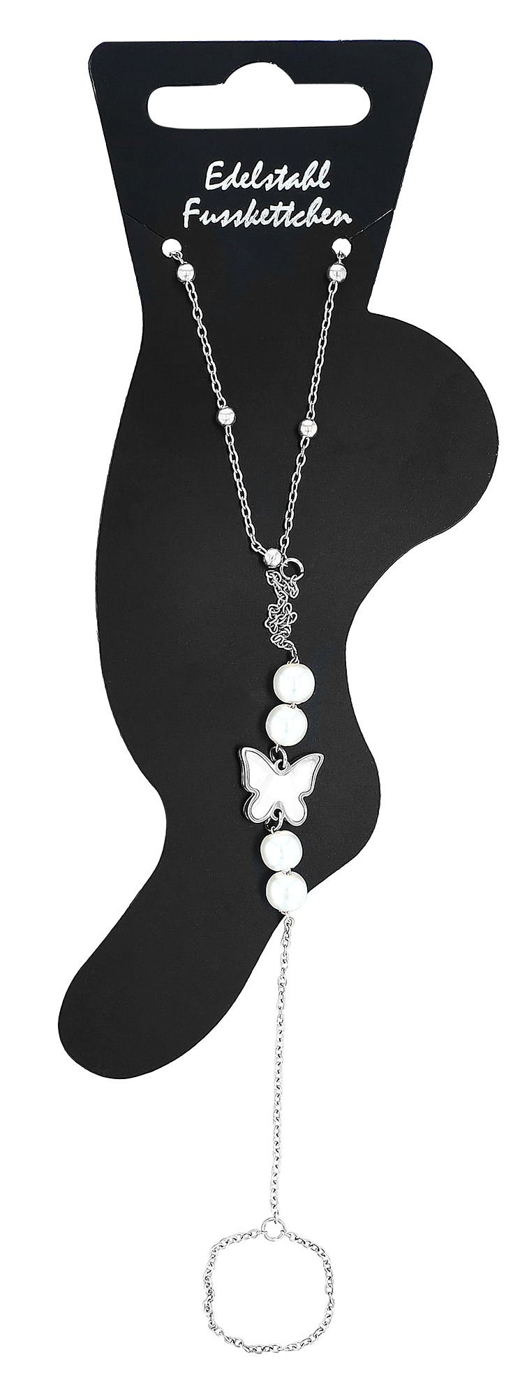 Hergestellt aus Edelstahl, ist diese Fusskette angenehm zu tragen. Mit einer Länge von 21 cm und einer praktischen 5 cm Verlängerung lässt sich die Kette individuell anpassen. Zarte Edelstahlperlen schmücken die Fusskette. Highlight die 16 cm lange Kette zum Zeh, sie wird durch vier Perlen (6 mm) sowie einem zentralen Schmetterling (12 x 11 mm) der mit Perlmutt besetzt ist, verziert – ein wahrer Hingucker! „Daisy“ - die Fusskette ist ein absolutes Sommer-Must-Have und ein ideales Accessoire für alle, die den angesagten Boho-Stil lieben und die ihre Füße mit einem besonderen Detail verschönern möchten..