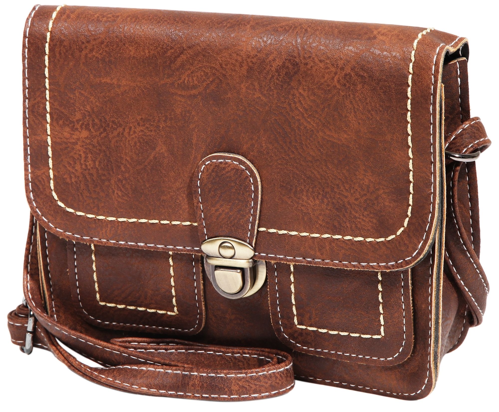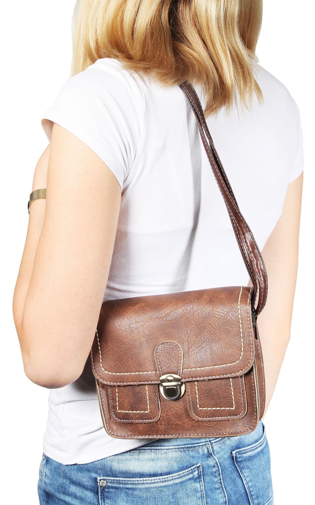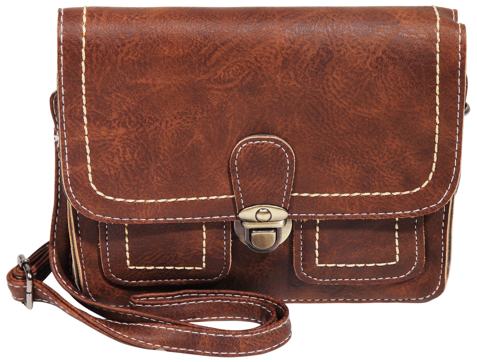 Die kompakte Handtasche ist aus robustem Lederimitat gefertigt und weist eine glatte Oberfläche auf. Die helle Naht im Außen- und Innenbereich sorgt für eine gute Haltbarkeit und Stabilität und setzt sich farblich gekonnt ab. Zudem beinhaltet die Tasche einen langen 13 mm breiten Tragehenkel, der auf eine maximale Länge von ca. 120 cm verlängert werden kann. Die Umhängetasche verfügt über ein geräumiges Innenfach welches mit einem Überschlag und Steckverschluss gesichert werden kann. Zwei weitere kleine Fächer dienen zur Unterbringung von kleinen Gegenständen. Die stilsichere Tasche ist ein modischer Allrounder, der sich zu vielen Gelegenheiten ausführen lässt. Zusätzlich überzeugt hier nicht nur das Design, sondern die Möglichkeit der Aufbewahrung aller wichtigen Gegenstände. Ob für einen gemütlichen Spaziergang, zum Einkaufen oder einen Ausflug - mit dieser Handtasche erhalten Sie einen idealen Gefährten aus robusten Materialien. Die Größe der Tasche ergibt sich im ungefüllten Zustand aus einer Länge von 16 cm, einer Breite von 19,5 cm und einer Materialstärke von 7,5 cm.