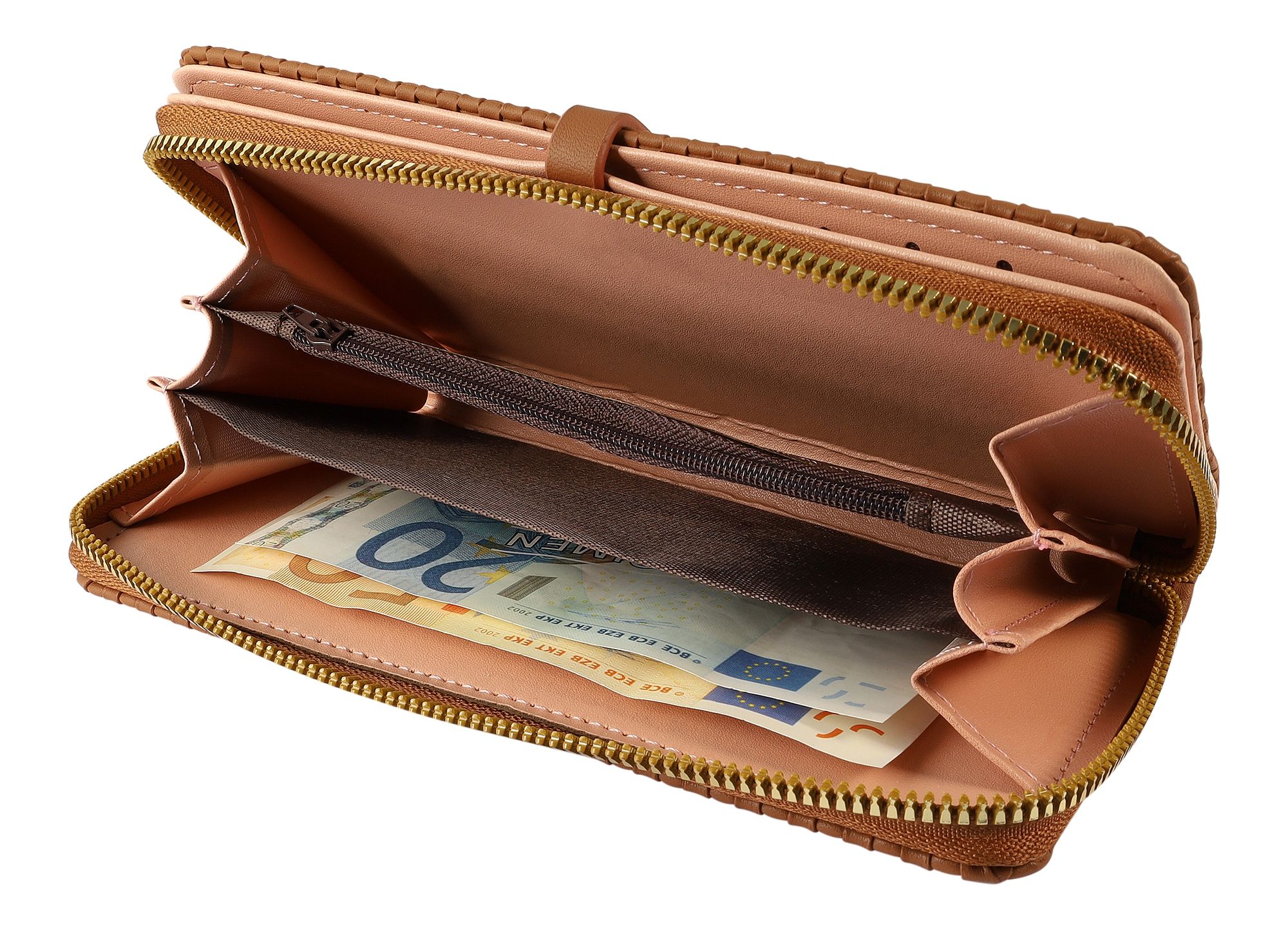 - Ein Hauptfach für Scheine und Münzgeld, das sich mit einem Reißverschluss sicher verschließen lässt.