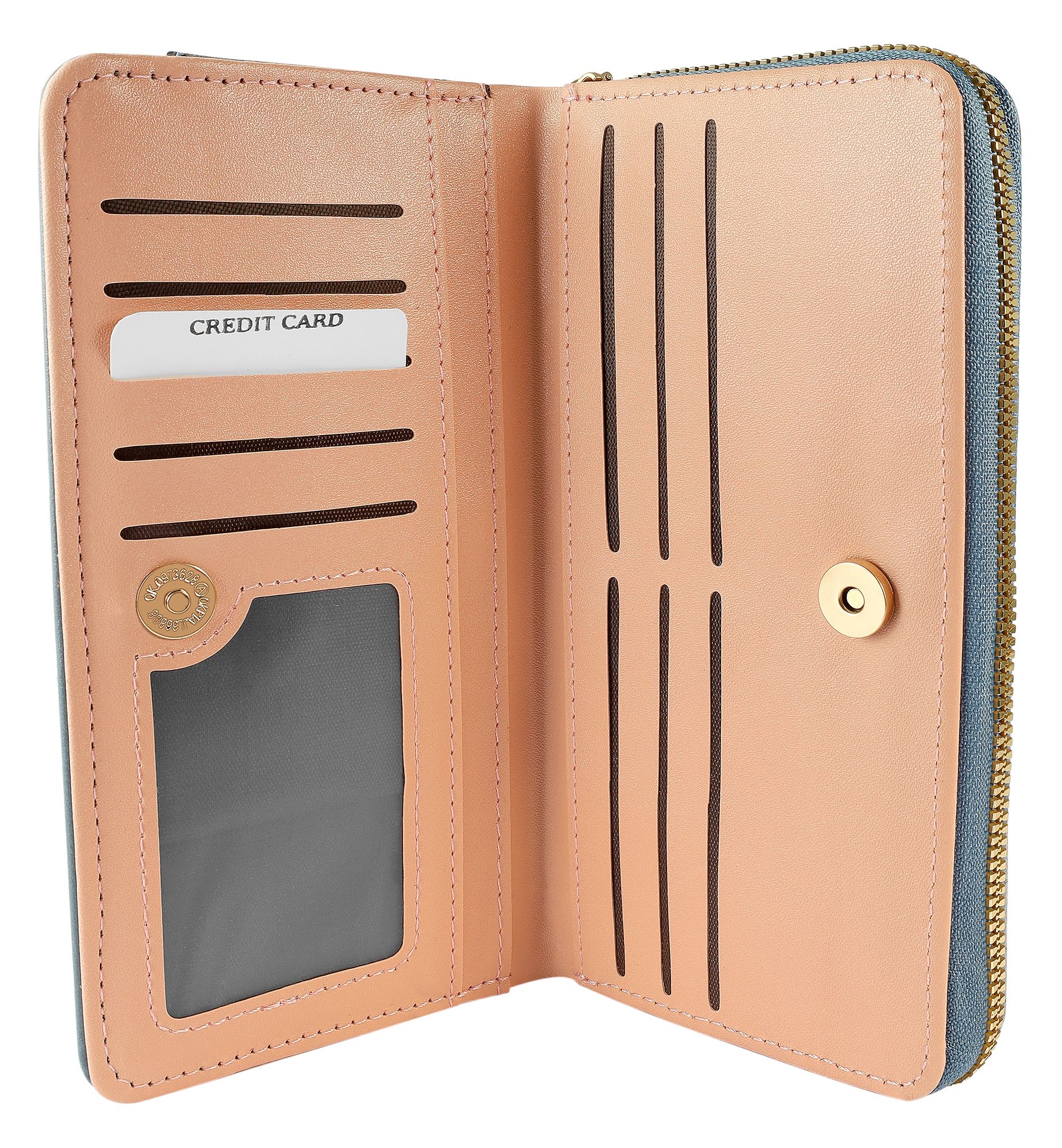 - Ein zusätzliches Fach, gesichert mit einem Druckknopf, offenbart ein cleveres Innenleben mit zehn Kreditkartenfächern, einem transparenten Ausweisfach und vier praktischen Einsteckfächern.