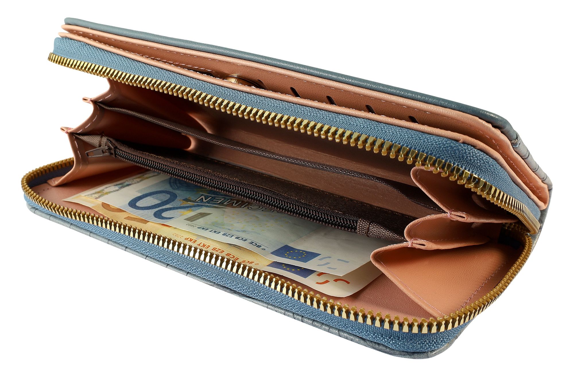 - Ein sicheres Hauptfach mit Reißverschluss bietet Platz für Scheine und Münzgeld.