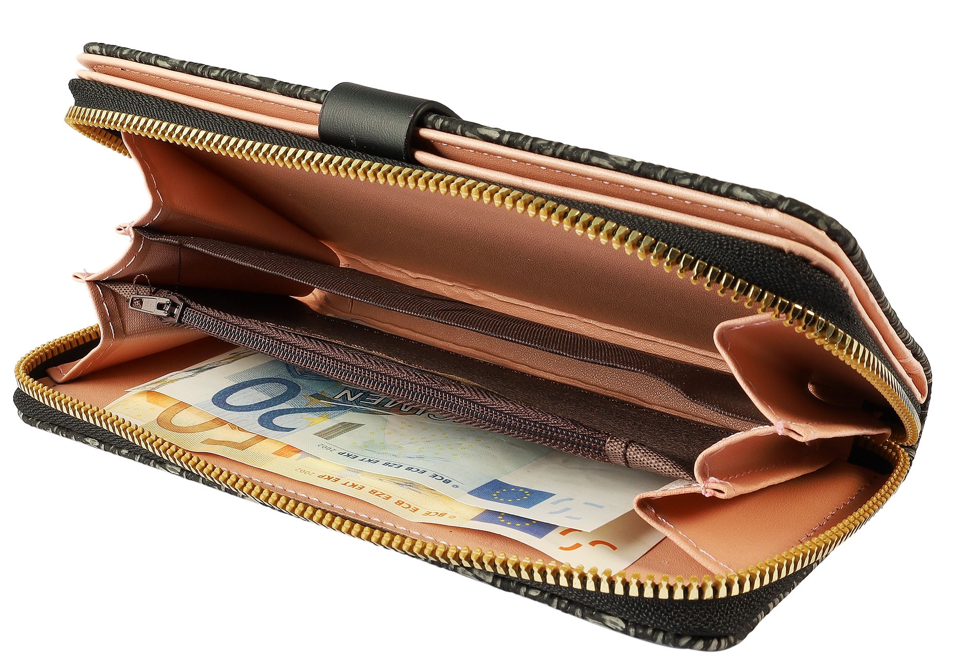 - Ein sicheres Hauptfach mit Reißverschluss bietet Platz für Scheine und Münzen.
