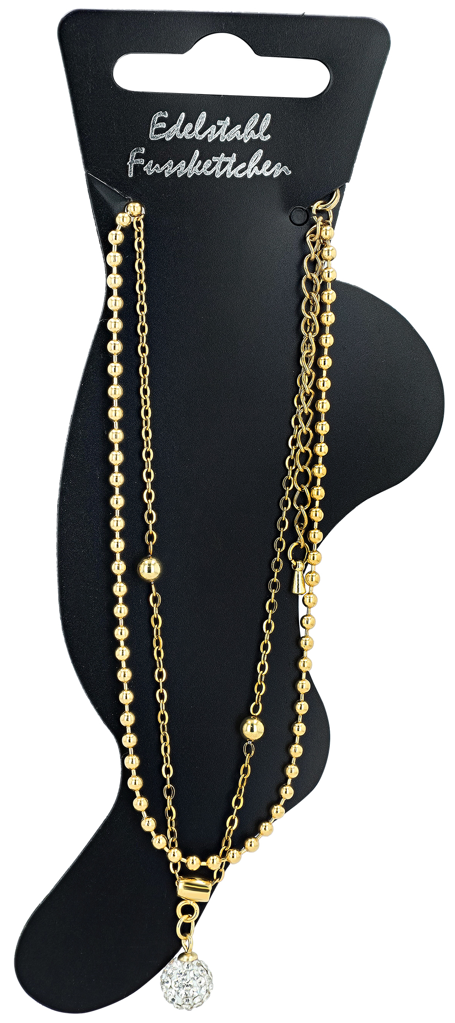 Dieses elegante Fußkettchen aus hochwertigem Edelstahl in kühlem Silberton oder warmem Goldton mit einer Länge von 24 cm und einer Breite von 6 mm bei einer Stärke von 4 mm zeichnet sich durch sein zweireihiges Design im Anker- und Kugelkettenmuster aus: zwei miteinander kontrastierende Ketten aus Edelstahl, die das Fußgelenk stilvoll umschmeicheln.