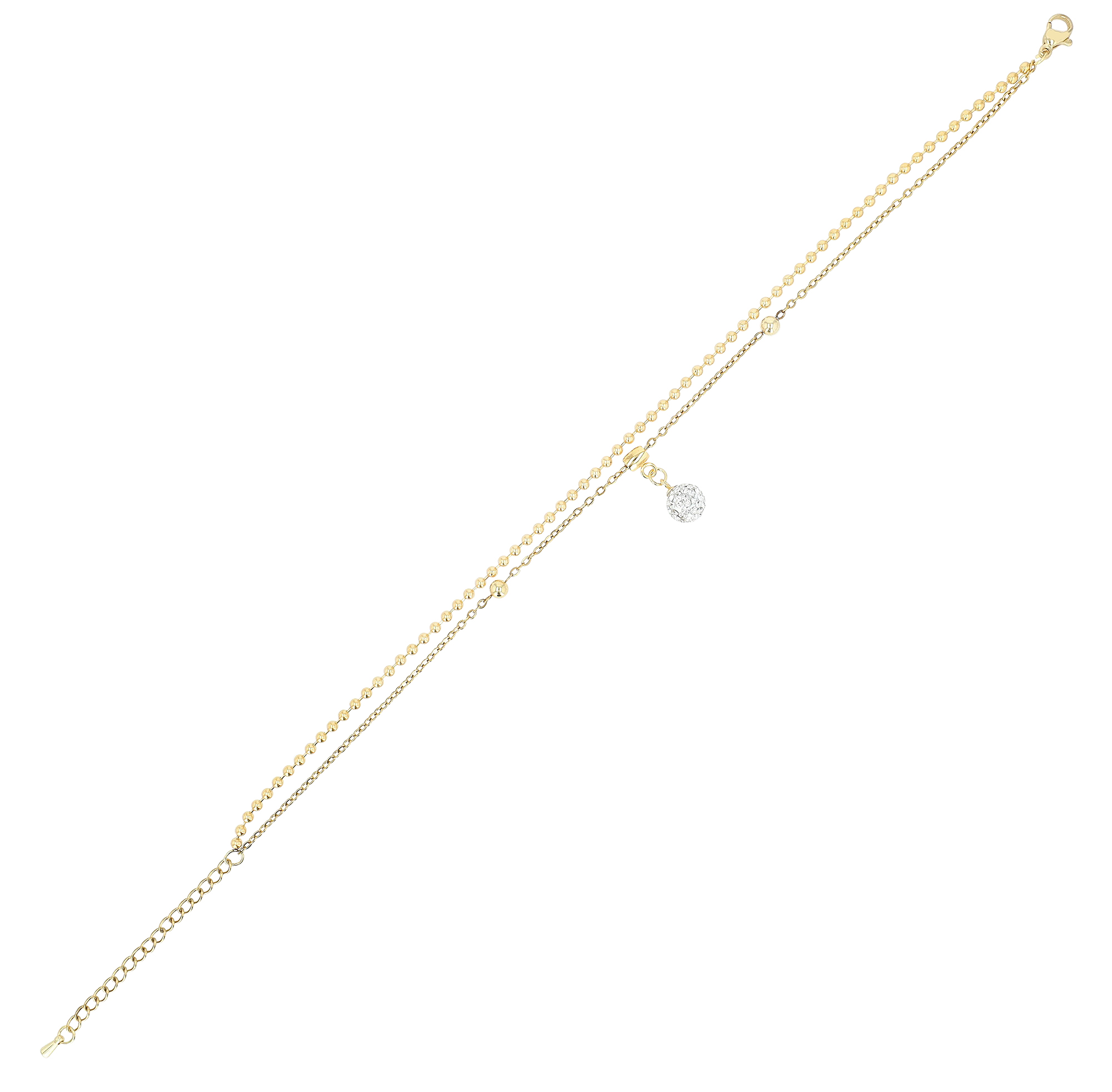 Die obere der beiden Ketten im Kugelmuster besteht aus aneinander gereihten Kugeln mit einem Durchmesser von 2 mm. Entlang der unteren Kette sind größere polierte Kugeln mit einem Durchmesser von 4 mm in regelmäßigen Abständen angebracht, die dem Schmuckstück einen subtil verspielten Akzent verleihen. Der zentrale Blickfang ist ein funkelnder, runder Anhänger mit einem Durchmesser von 8 mm, bestückt mit zahllosen, facettierten Similisteinen mit einem Durchmesser von jeweils 2 mm, die das Licht kunstvoll reflektieren. Für optimalen Tragekomfort und eine individuelle Anpassung sorgt der Karabinerverschluss mit Verlängerungskette (5 cm), welcher eine variable Passform ermöglicht.