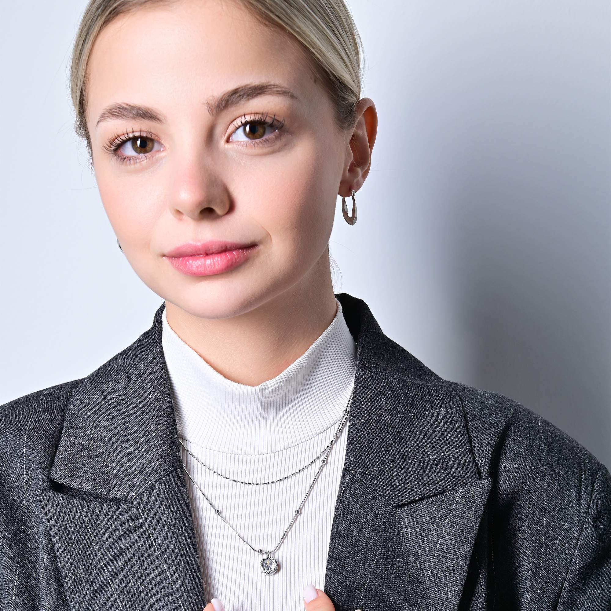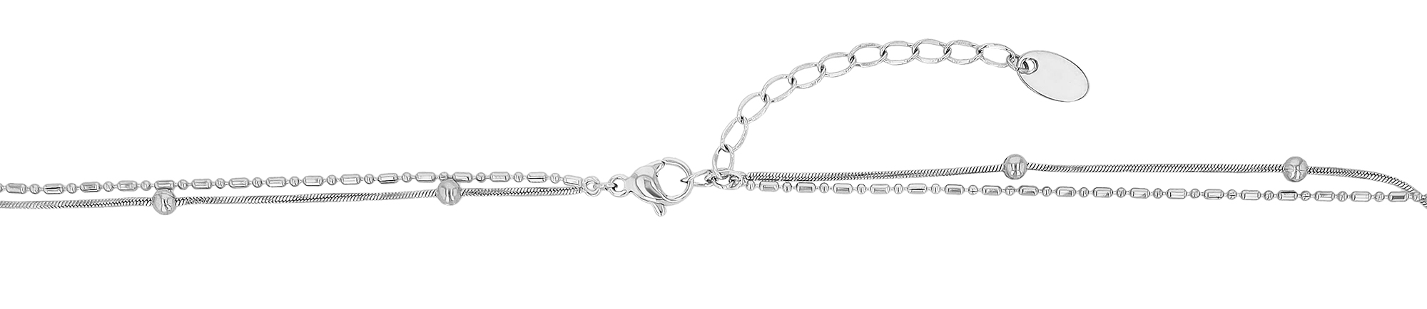 Diese edle, zweireihige Edelstahlkette kombiniert filigrane Leichtigkeit mit stilvoller Raffinesse. Die Längen von 41,5 cm und 48 cm, ergänzt durch eine 5 cm Verlängerung, ermöglichen eine flexible Anpassung. Die obere Kette besticht durch ein dezentes Muster, während die untere Schlangenkette mit einem runden Anhänger (Ø 10 mm) und einem funkelndem Zirkonia im Mittelpunkt einen eleganten Akzent setzt. Zusätzliche kleine Kugeln im Abstand von 3 cm verleihen dem Design eine besondere Note.
