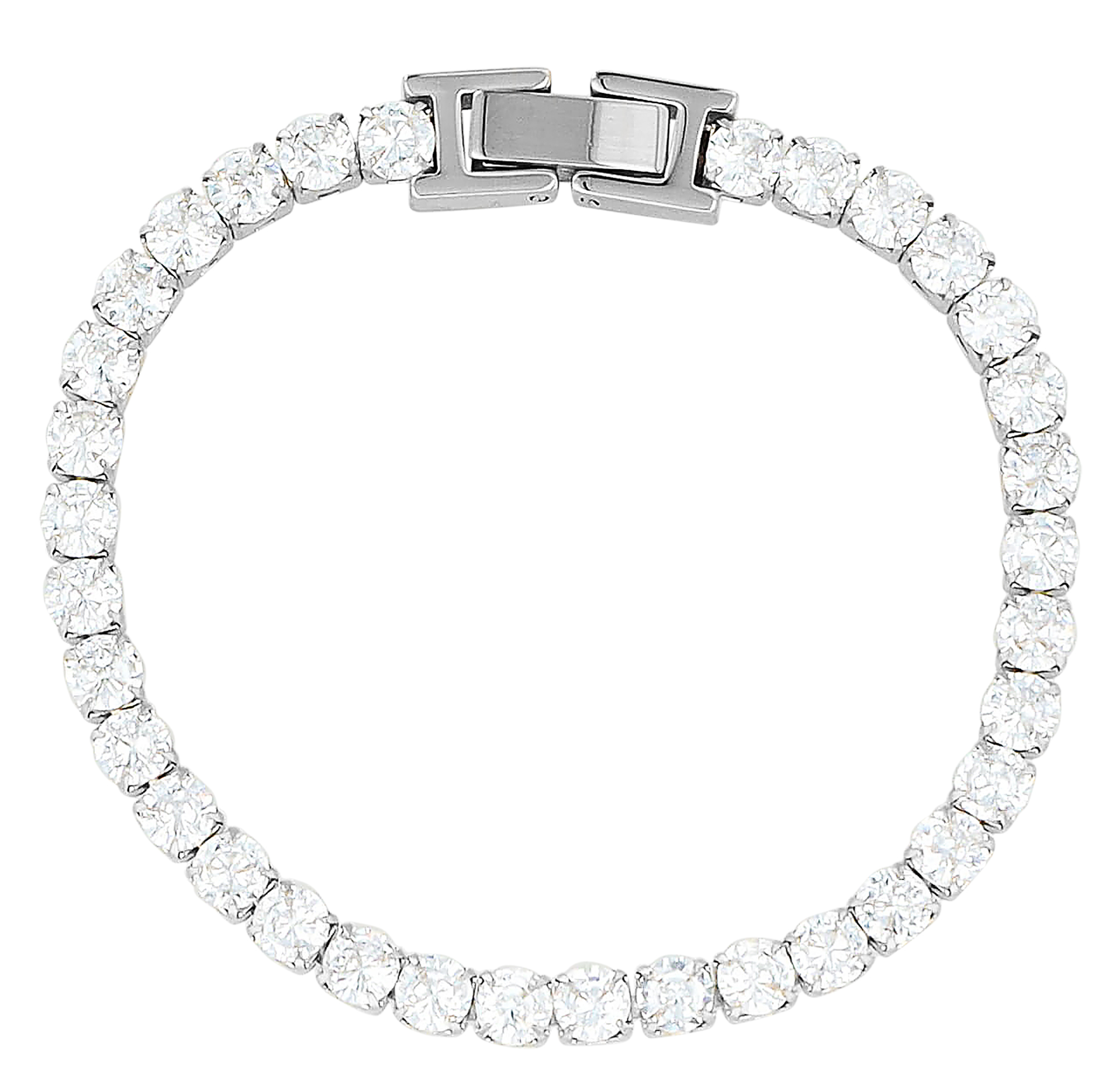 Aus hochwertigem Edelstahl hat das Tennis-Armband eine Länge von 17,5 cm und kann dank der mitgelieferten Verlängerung auf 19 cm angepasst werden. Mit einer Breite von 4 mm und einer Stärke von 3 mm ist das Armband ein Highlight am Handgelenk. Der praktische Edelstahl-Durchschub-Klappverschluss hält das Armband sicher am Handgelenk der Trägerin